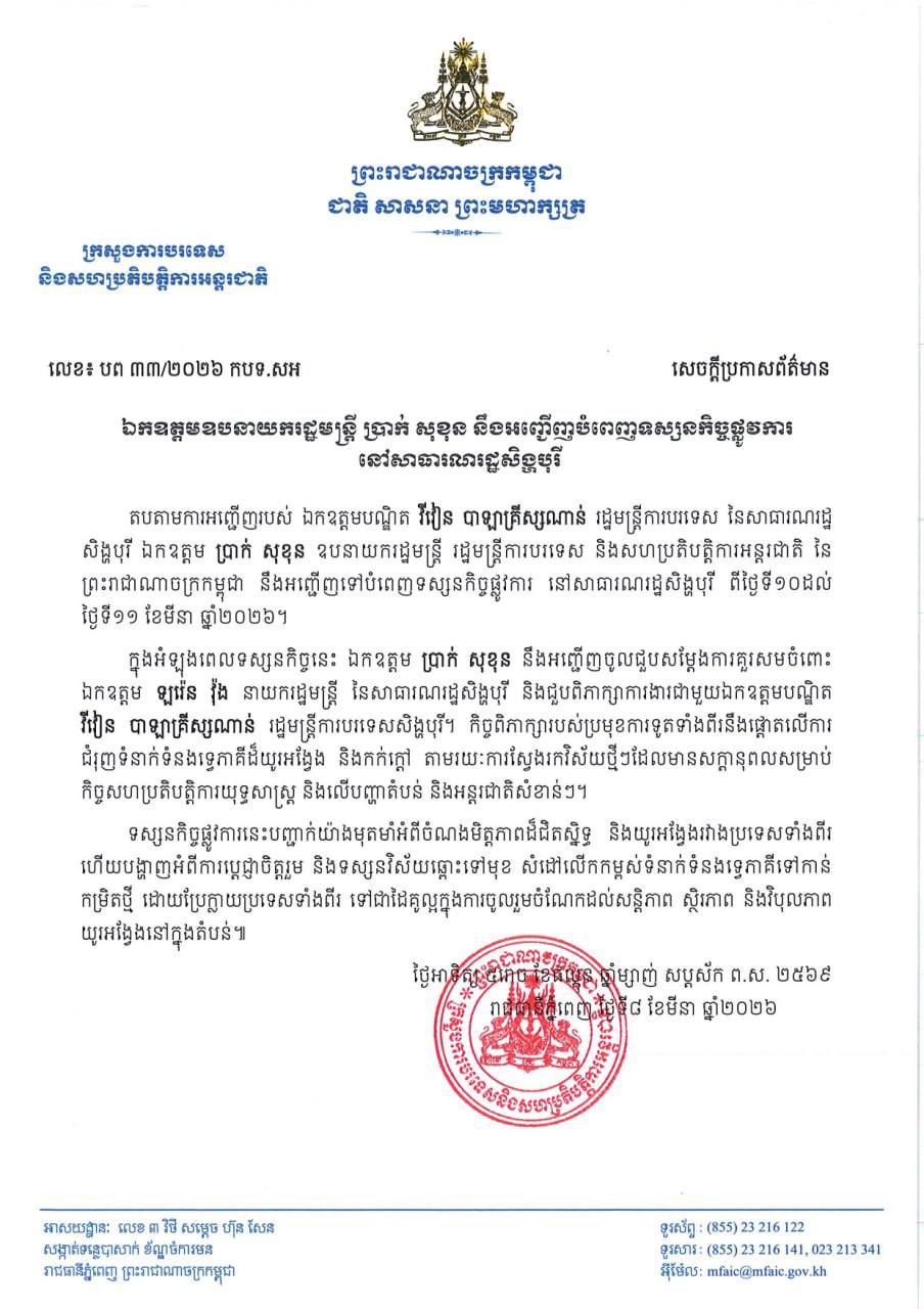 រាជធានីភ្នំពេញ៖ លោកឧបនាយករដ្ឋមន្រ្តី ប្រាក់ សុខុន រដ្ឋមន្ត្រីការបរទេស និងសហប្រតិបត្តិការអន្តរជាតិ នឹងអញ្ជើញទៅបំពេញទស្សនកិច្ចផ្លូវការ នៅសាធារណរដ្ឋសិង្ហបុរី ចាប់ពីថ្ងៃទី១០ដល់ថ្ងៃទី១១ ខែមីនា ឆ្នាំ២០២៦ខាងមុខនេះ…។
