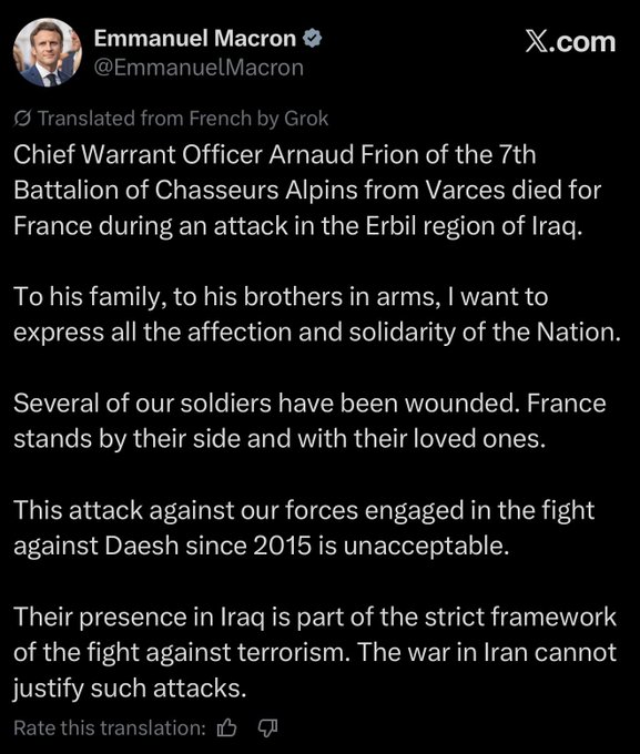 រដ្ឋធានីបាកដាដ៖ ឈាមទាហានបារាំងត្រូវបានហូរស្រក់នៅក្នុងសមរភូមិនៃដើមបូព៌ា! នៅថ្ងៃសុក្រទី១៣ ខែមីនា ប្រធានាធិបតីបារាំង លោក អេម៉ានូអែល ម៉ាក្រុង បានចេញមុខថ្កោលទោសទាំងកំហឹង និងការឈឺចាប់ ចំពោះការវាយប្រហារដ៏សាហាវមួយនៅតំបន់ភាគខាងជើងប្រទេសអ៊ីរ៉ាក់ ដែលបានសម្លាប់មន្ត្រីយោធាបារាំងម្នាក់ និងធ្វើឱ្យទាហានជាច្រើននាក់ទៀតរងរបួស នៅក្នុងតំបន់អឺប៊ីល (Erbil)។