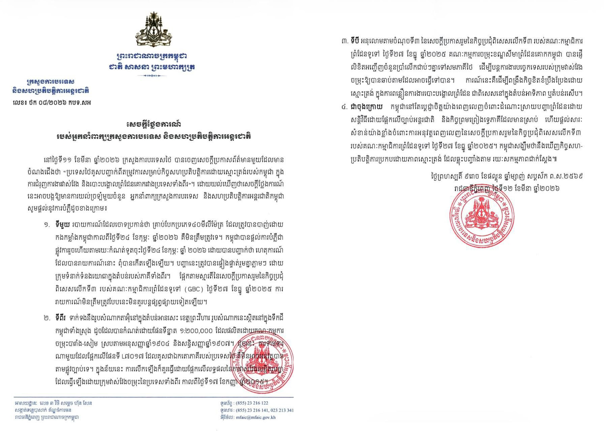 កម្ពុជា ក៏បានច្រានចោលចំពោះរបាយការណ៍ដែលថៃចោទប្រកាន់ថា កងកម្លាំងកម្ពុជា បានបាញ់គ្រាប់បែកប្រភេទ៤០មិល្លីម៉ែត្រ កាលពីថ្ងៃទី២៤ ខែកុម្ភៈ ឆ្នាំ២០២៦។ ក្រសួងការបរទេសកម្ពុជា លើកឡើងទៀតថា គណៈកម្មការចម្រុះខណ្ឌសីមាព្រំដែនគោកកម្ពុជា ក៏បានផ្ញើលិខិតអញ្ជើញចំនួន៥លើកជាប់ៗគ្នាទៅភាគីថៃ ដើម្បីបន្តការងារបច្ចេកទេសរបស់ក្រុមវាស់វែងចម្រុះឱ្យបានឆាប់តាមដែលអាចធ្វើទៅបាន ដើម្បីពង្រឹងកិច្ចខិតខំប្រឹងប្រែងដោយស្មោះត្រង់ ក្នុងការពន្លឿនការងារបោះបង្គោលព្រំដែន ជាពិសេសនៅក្នុងតំបន់អាទិភាព ឬតំបន់រសើប។