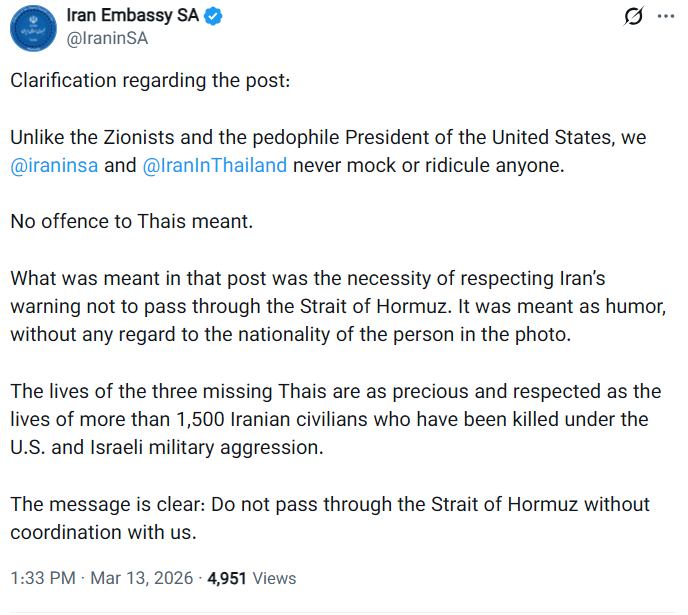 នៅថ្ងៃសុក្រទី១៣ ខែមីនានេះ ស្ថានទូតអ៊ីរ៉ង់ប្រចាំនៅអាហ្វ្រិកខាងត្បូង បានបង្ហោះសារមួយបង្កប់ដោយខ្លឹមសារ៖«ព្រមានផង សើចចំអកផង និងឌឺដងផង» ទៅកាន់ភាគីថៃ ថា៖«[..]ខុសពីពួកស៊ីយ៉ូនីស (ដែលសំដៅទៅលើ អ៊ីស្រាអែល) និងប្រធានាធិបតីលោភលន់របស់សហរដ្ឋអាម៉េរិក យើងខ្ញុំ @iraninsa [សំដៅលើអ៊ីរ៉ង់នៅអាហ្វ្រិកខាងត្បូង] និង @IranInThailand [អ៊ីរ៉ង់ក្នុងប្រទេសថៃ] មិនដែលចំអក ឬមើលងាយនរណាម្នាក់ឡើយ»។