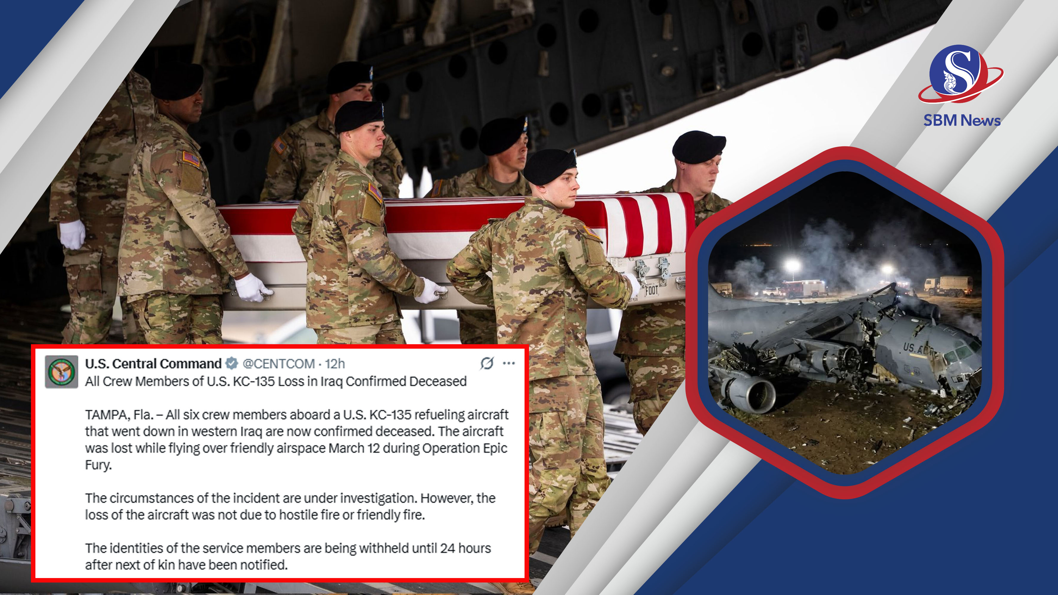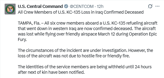 កាលពីថ្ងៃសុក្រទី១៣ ខែមីនា យន្តហោះចាក់ប្រេងលើអាកាសរបស់សហរដ្ឋអាម៉េរិក ប្រភេទ KC-135 បានធ្លាក់នៅភាគខាងលិចប្រទេសអ៊ីរ៉ាក់ អំឡុងពេលប្រតិបត្តិការមហាកំហឹង ឬ Epic Fury ប្រឆាំងនឹងប្រទេសអ៊ីរ៉ាក់ ខណៈយោធាអាម៉េរិកក្នុងតំបន់ បានព្យាយាមអនុវត្តកិច្ចប្រឹងប្រែងជួយសង្គ្រោះយន្តហោះ KC-135 ដែលបានធ្លាក់នោះ ព្រោះមានផ្ទុកកងទ័ពរហូតដល់ទៅ៦នាក់។ ជាអកុសល កងទ័ពអាម៉េរិកទាំង៦រូបនោះ ស្លាប់ទាំងអស់។ យោធាអ៊ីរ៉ង់ បានអះអាងនៅក្នុងសេចក្តីថ្លែងការណ៍ថា ក្រុមសម្ព័ន្ធមិត្តរបស់ខ្លួននៅក្នុងប្រទេសអ៊ីរ៉ាក់ បានបាញ់ទម្លាក់យន្តហោះអាម៉េរិកមួយនេះ ដោយប្រើមីស៊ីល។
