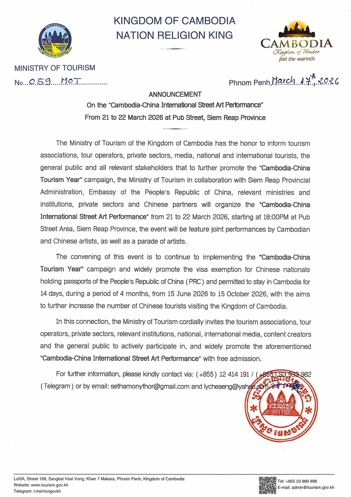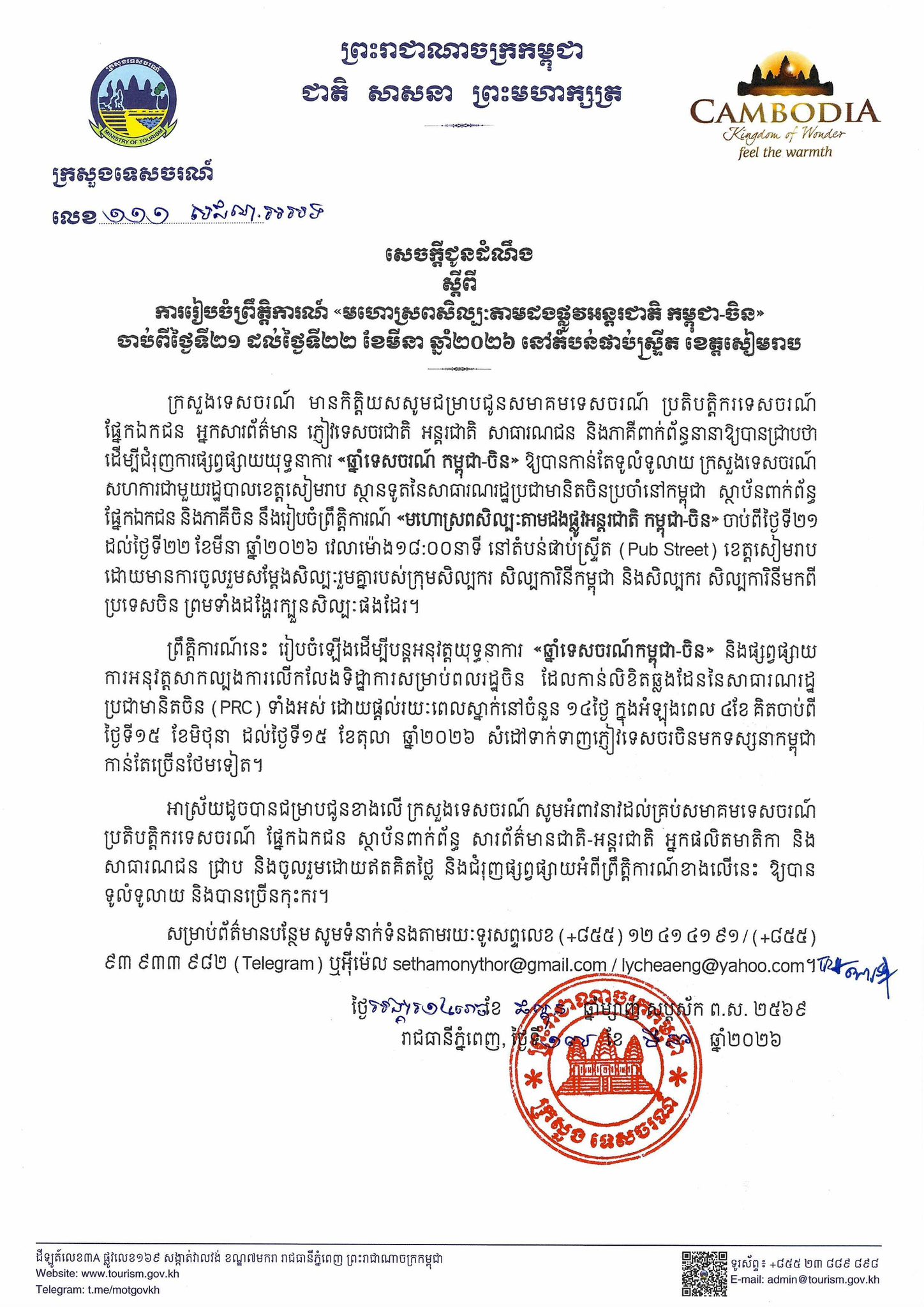 ក្រសួងទេសចរណ៍ជូនដំណឹងដល់ភាគីពាក់ព័ន្ធ ជាពិសេសភ្ញៀវទេសចរជាតិ អន្តរជាតិថា «មហោស្រពសិល្បៈតាមដងផ្លូវអន្តរជាតិកម្ពុជា-ចិន» នឹងចាប់ផ្តើមចាប់ពីថ្ងៃទី២១ ដល់ថ្ងៃទី២២មីនា នៅវេលាម៉ោង៦ល្ងាច ដោយមានការសម្ដែងសិល្បៈរួមគ្នាពីក្រុមសិល្បករ-សិល្បការិនីកម្ពុជា និងចិន រួមជាមួយការដង្ហែក្បួនសិល្បៈ។ ចំពោះគោលដៅរៀបចំមហោស្រពវិញ ក្រៅតែពីជំរុញការផ្សព្វផ្សាយយុទ្ធនាការឆ្នាំទេសចរណ៍ទ្វេភាគី វាក៏ជាឱកាសសម្រាប់កម្ពុជា ផ្សព្វផ្សាយការអនុវត្តសាកល្បងការលើកលែងទិដ្ឋាការសម្រាប់ពលរដ្ឋចិន កាន់លិខិតឆ្លងដែនចិន(PRC)ទាំងអស់ ក្នុងរយៈពេលស្នាក់នៅកម្ពុជាចំនួន១៤ថ្ងៃ នៅចន្លោះថ្ងៃទី១៥មិថុនា ដល់ថ្ងៃទី១៥តុលា ឆ្នាំ២០២៦ សំដៅទាក់ទាញភ្ញៀវទេសចរចិន មកទស្សនាកម្ពុជាបន្ថែម។