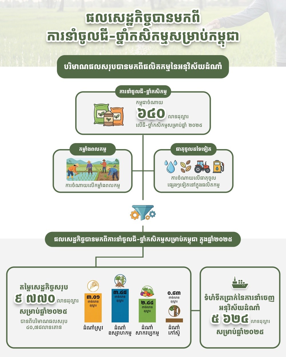 អ្នកនាំពាក្យក្រសួងកសិកម្មរូបនេះ បានឱ្យដឹងនៅថ្ងៃទី១៧មីនានេះថា ការនាំធាតុចូលកសិកម្ម ជាពិសេស អ្វីដែលយើងនៅមិនទាន់មានសមត្ថភាពផលិតបាននៅឡើយ ដូចជា៖ ជី ថ្នាំគីមីជាដើម មិនមែនជាការខាតបង់ទេ។ ផ្ទុយទៅវិញ វាគឺជាកម្លាំងជំរុញដ៏សំខាន់សម្រាប់កំណើនសេដ្ឋកិច្ចជាតិយ៉ាងធំធេង។ អ្នកនាំពាក្យអះអាងបន្តថា កាលពីឆ្នាំ២០២៥ ផលសេដ្ឋកិច្ចដែលកម្ពុជាទទួលបានពីការប្រើប្រាស់ធាតុចូលកសិកម្មទាំងនេះ បង្កើតជាតម្លៃសេដ្ឋកិច្ចរហូតដល់៩៧៧០លានដុល្លារ បានពីបរិមាណផលសរុប៤០,៧៨លានតោន ក្នុងនោះ៖ ដំណាំស្រូវជាង៣ពាន់លានដុល្លារ, ដំណាំឧស្សាហកម្មជាង៣ពាន់លានដុល្លារ, ដំណាំសាកវប្បកម្មជាង២ពាន់លានដុល្លារ និងដំណាំកៅស៊ូជិត១ពាន់លានដុល្លារ។ វាមិនត្រឹមតែធានាបាននូវសន្តិសុខស្បៀងប៉ុណ្ណោះទេ ថែមទាំងអនុញ្ញាតឱ្យកម្ពុជាទាញយកចំណូលពីការនាំចេញកសិផលរហូតដល់ទៅ៥៦២៤លានដុល្លារផងដែរ។