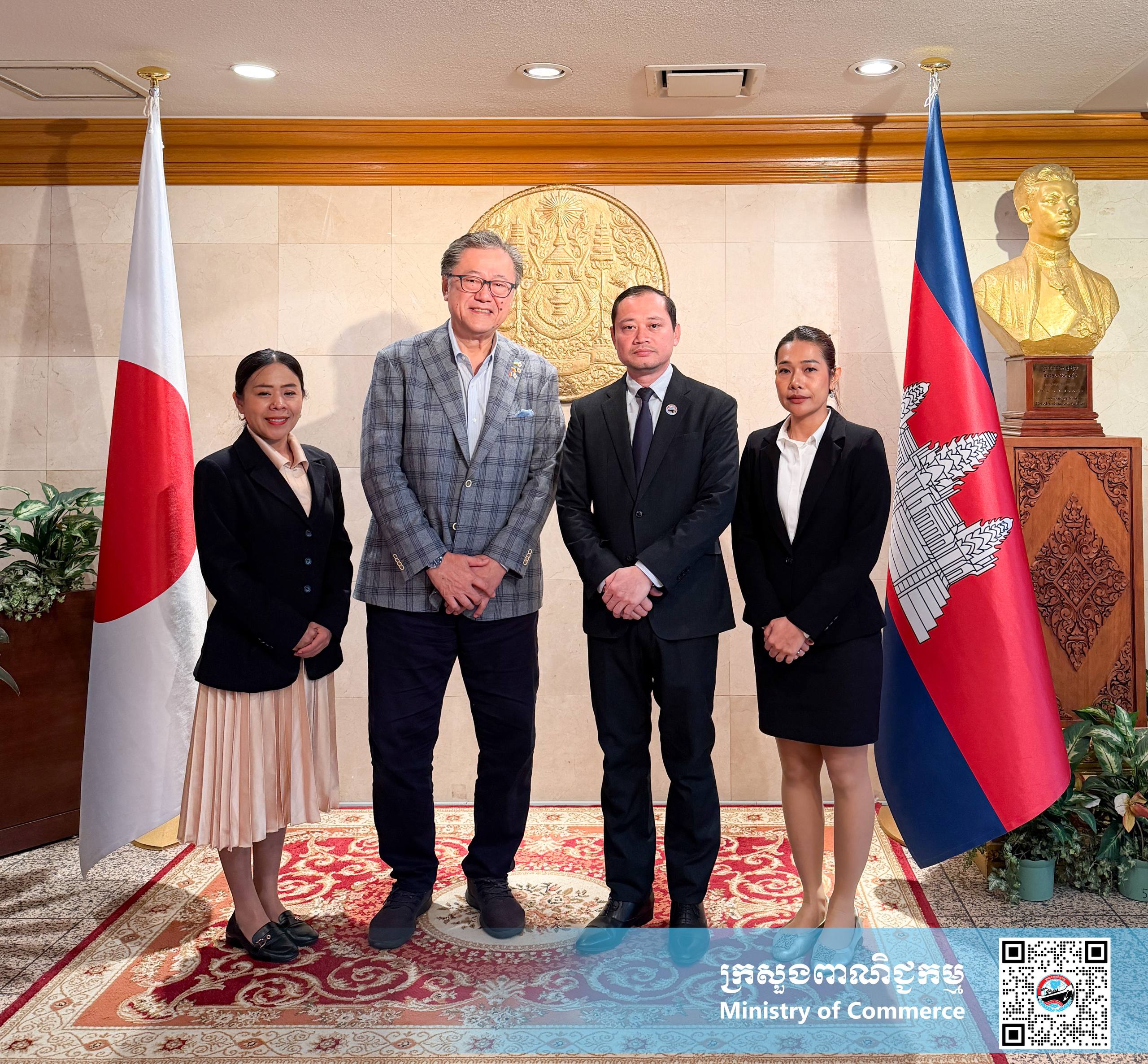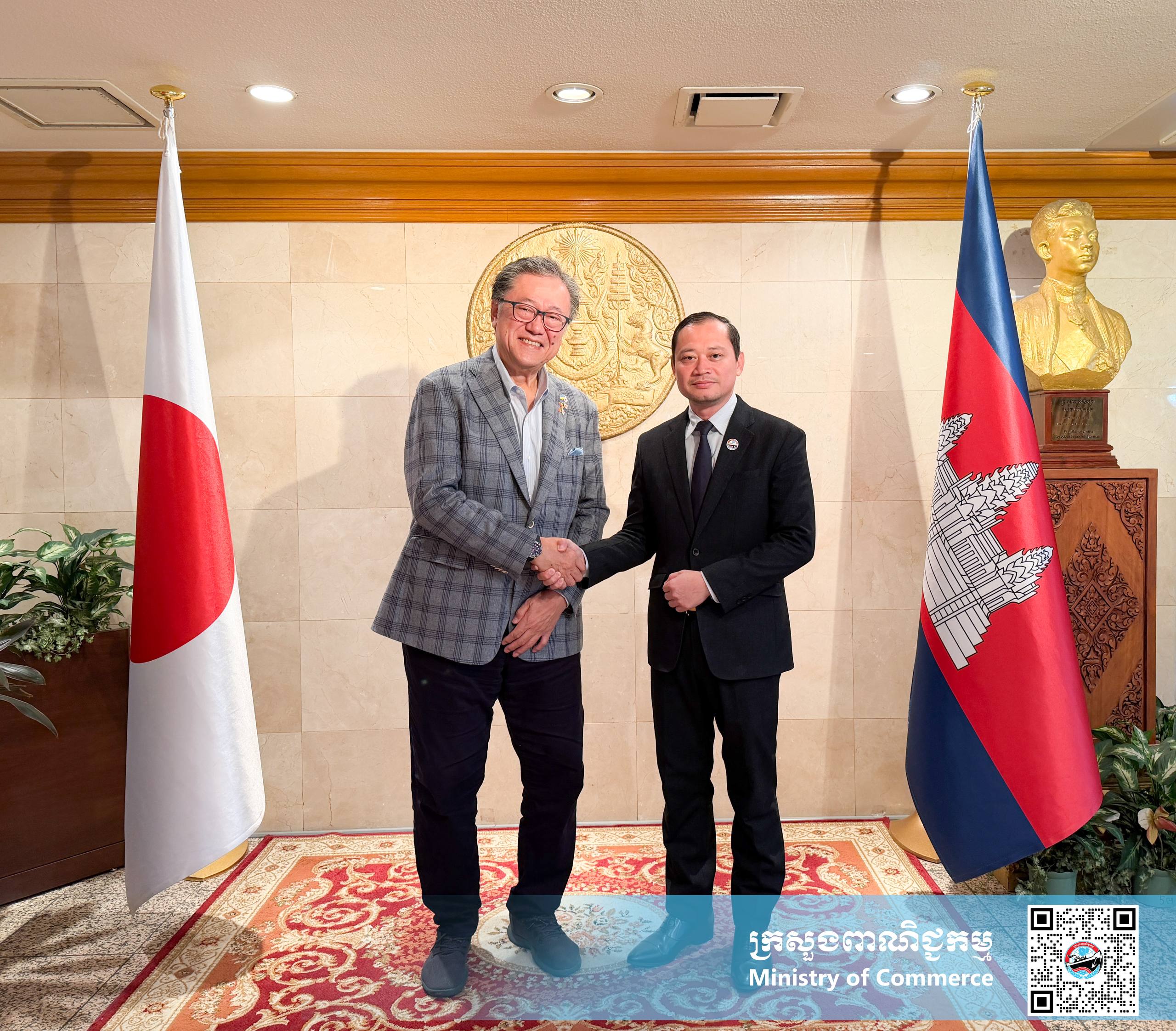 ក្រសួងពាណិជ្ជកម្មបានឱ្យដឹងថា ថ្មីៗនេះ លោក ស៊ីន សារ៉ាយ អនុព័ន្ធពាណិជ្ជកម្មអមស្ថានឯកអគ្គរាជទូតកម្ពុជាប្រចាំប្រទេសជប៉ុន បានជួបពិភាក្សាការងារជាមួយលោក តានីមូរ៉ា សូគី ប្រធានក្រុមហ៊ុន Jumbo Tours Co., Ltd. នៅខេត្តអូគីណាវ៉ា និងលោកស្រី សត វិជ្ជរី ប្រធានក្រុមហ៊ុន Magokoro Cambodia នៅខេត្តសៀមរាប ដោយភាគីទាំងពីរ បានផ្លាស់ប្ដូរទស្សនៈជុំវិញការជំរុញឱ្យមានការបើកដំណើររការយន្តហោះពិសេស រវាងសៀមរាប/ភ្នំពេញ និងខេត្តអូគីណាវ៉ា ប្រទេសជប៉ុន ក្នុងទិសដៅជំរុញកំណើនអ្នកទេសចររវាងប្រទេសទាំងពីរ។ ភាគីកម្ពុជា-ជប៉ុន ក៏បានពិភាក្សា ជុំវិញការបន្តផ្តល់ជំនួយជាអគារសិក្សា និងសម្ភារសិក្សាដល់សិស្សនិស្សិតក្រីក្រនៅខេត្តសៀមរាប និងសាលាបណ្ដុះបណ្ដាលភាសាជប៉ុន ដើម្បីរួមចំណែកដល់ការអភិវឌ្ឍធនធានមនុស្សនៅកម្ពុជា និងគម្រោងបើកភោជនីយដ្ឋានខ្មែរ នៅខេត្តអូគីណាវ៉ា ដើម្បីលើកកម្ពស់ម្ហូបអាហារខ្មែរនៅក្នុងទីផ្សារជប៉ុន។