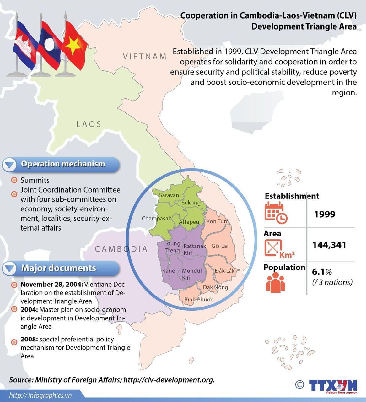 កិច្ចសហប្រតិបត្តិការតំបន់ត្រីកោណអភិវឌ្ឍន៍ កម្ពុជា-ឡាវ-វៀតណាម ឬ(CLV-DTA)នេះ គឺជាការរួមបញ្ចូលគ្នានៃប្រទេសទាំងបី ដើម្បីជំរុញការអភិវឌ្ឍសេដ្ឋកិច្ច ពាណិជ្ជកម្ម ហេដ្ឋារចនាសម្ព័ន្ធ និងកិច្ចសហប្រតិបត្តិការផ្សេងទៀត នៅតំបន់ព្រំដែន ដោយក្នុងនោះភាគីកម្ពុជា មានខេត្តចំនួន៤នៅភាគឦសាន្តជាប់ជាមួយបណ្តាខេត្តរបស់ប្រទេសឡាវដែលមាន៤ដែរ និងភាគីវៀតណាមមានខេត្ត៥ បូកបញ្ចូលគ្នាទាំងអស់មានខេត្តសរុប១៣។ គោលបំណងនៃការបង្កើតឱ្យមានតំបន់ត្រីកោណអភិវឌ្ឍន៍កម្ពុជា-ឡាវ-វៀតណាម នេះឡើង ក៏ព្រោះតែមេដឹកនាំនៃប្រទេសទាំងបី ចង់ជំរុញឱ្យផ្នែកសេដ្ឋកិច្ច ពាណិជ្ជកម្ម ក្លាយជាខ្លាកំណាចសេដ្ឋកិច្ចមួយនៅក្នុងតំបន់អាស៊ីអាគ្នេយ៍ ដែល (CLV-DTA) នឹងដើរតួនាទីជំនួស «ឥណ្ឌូចិន» ជុំវិញការតភ្ជាប់ទំនាក់ទំនងសេដ្ឋកិច្ច ពាណិជ្ជកម្ម និងនយោបាយ។ ប៉ុន្តែទោះជាយ៉ាងណាក៏ដោយ កិច្ចសហប្រតិបត្តិការតំបន់ត្រីកោណអភិវឌ្ឍន៍នេះបានមរណភាពទៅវិញ ក្រោយរស់បាន២៥ឆ្នាំ (១៩៩៩–២០២៤) បន្ទាប់ពីប្រទេសកម្ពុជា ប្រកាសដកខ្លួនចេញពីគម្រោងនេះជាផ្លូវការ នៅខែកញ្ញា ឆ្នាំ២០២៤។