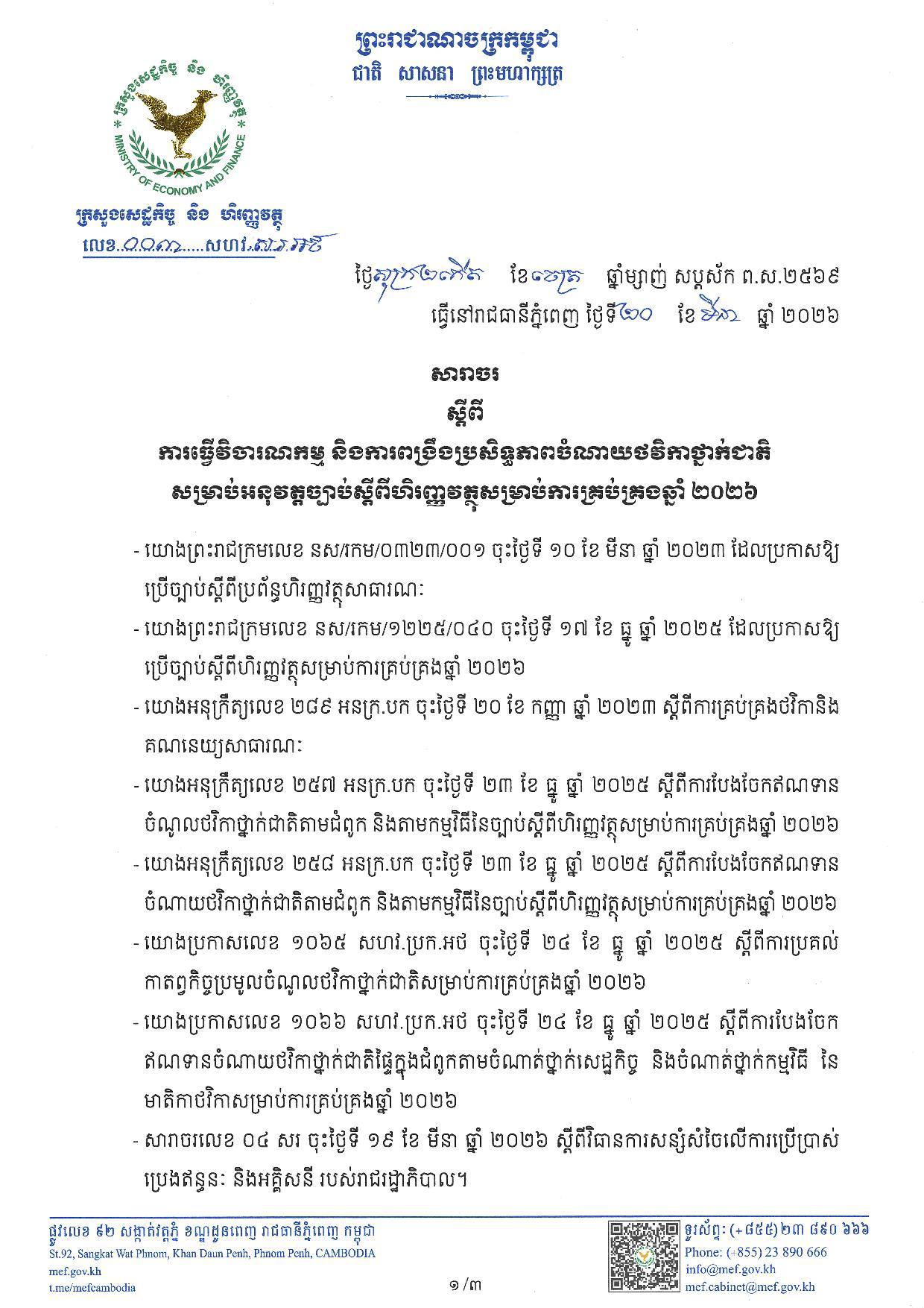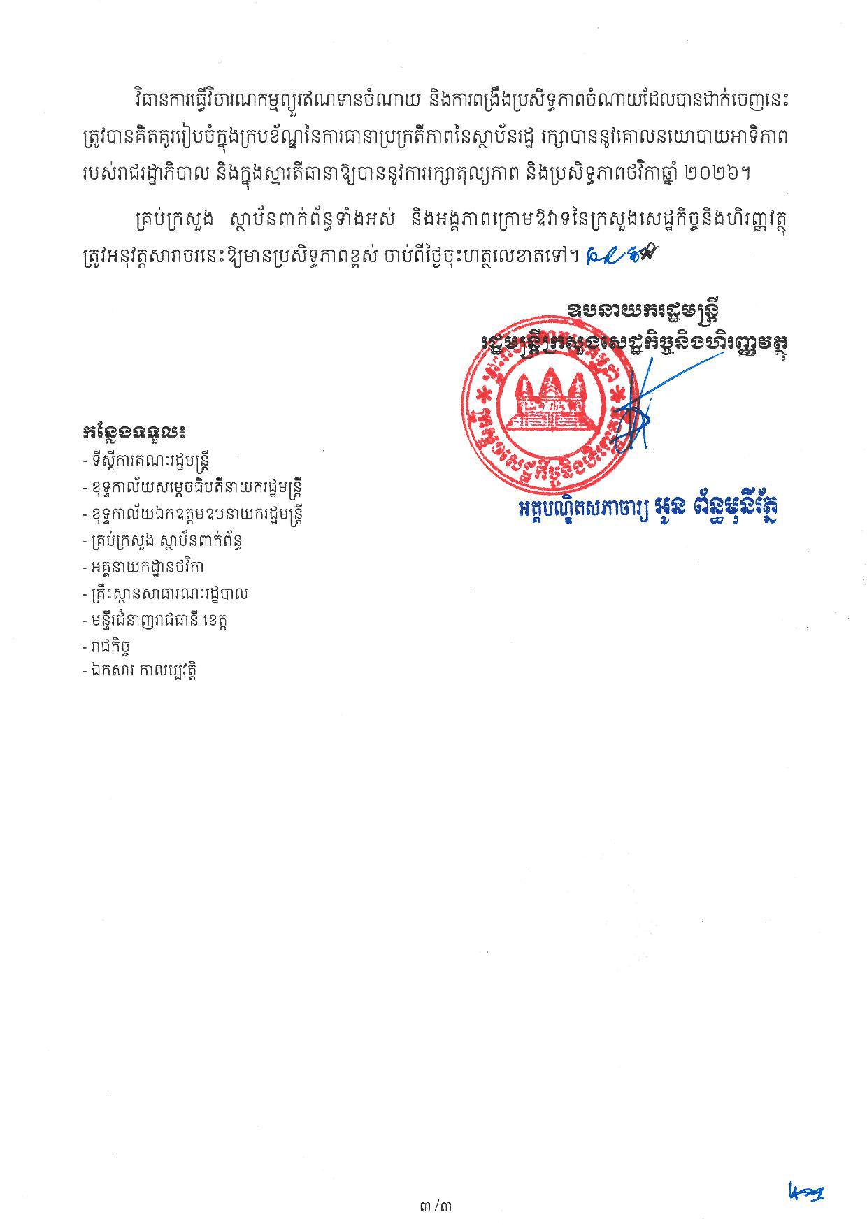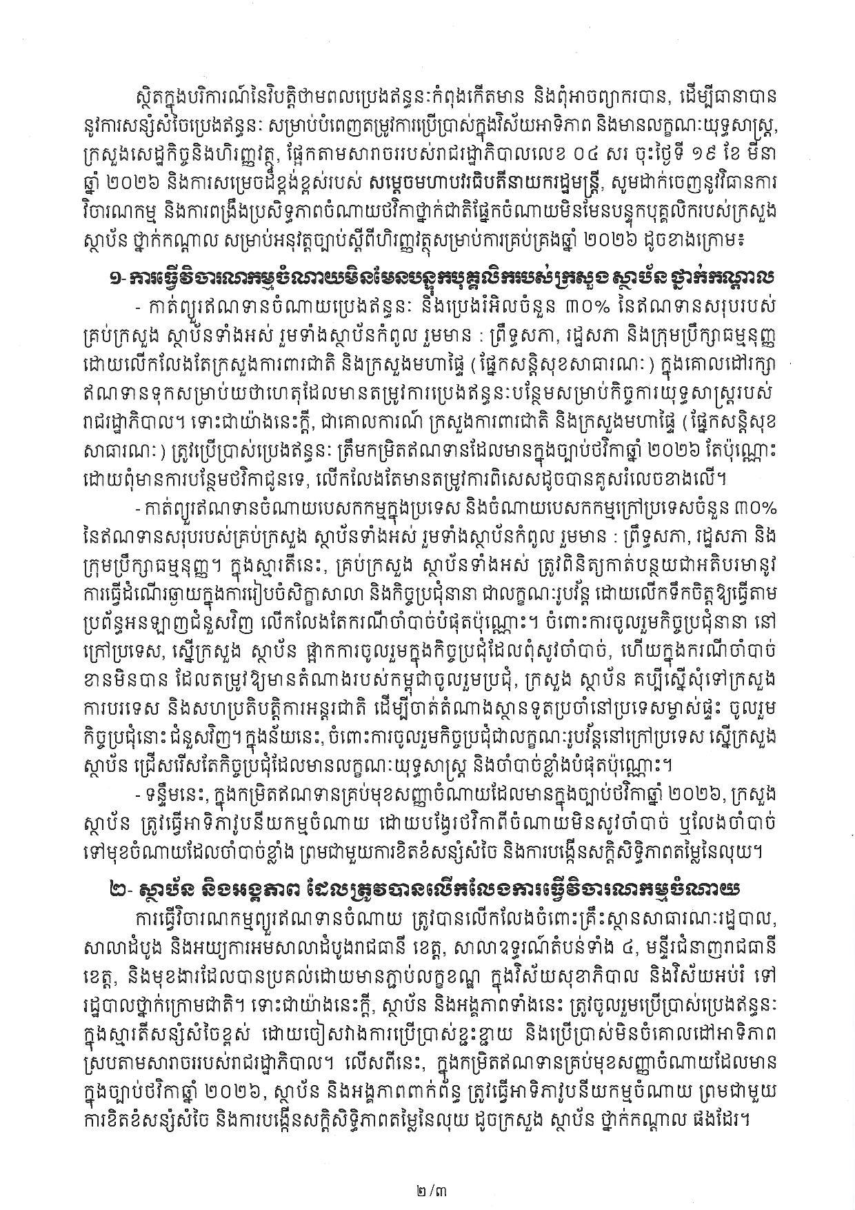 តាមរយៈសារាចរស្ដីពីការធ្វើវិចារណកម្ម និងការពង្រឹងប្រសិទ្ធភាពចំណាយថវិការថ្នាក់ជាតិ ចុះថ្ងៃទី២០មីនា ឆ្នាំ២០២៦ ហើយត្រូវបានផ្សព្វផ្សាយជាសាធារណៈនៅថ្ងៃទី២៤មីនា ក្រសួងសេដ្ឋកិច្ច បានដាក់ចេញវិធានការ ដោយសម្រេចកាត់ព្យួរឥណទានចំណាយប្រេងឥន្ធនៈ និងប្រេងរំអិលចំនួន៣០ភាគរយ និងឥណទានចំណាយបេសកកម្មក្នុងប្រទេស និងចំណាយបេសកកម្មក្រៅប្រទេសចំនួន៣០ភាគរយ នៃឥណទានសរុបរបស់គ្រប់ក្រសួង-ស្ថាប័នទាំងអស់ រួមទាំងស្ថាប័នកំពូល រួមមាន៖ ព្រឹទ្ធសភា, រដ្ឋសភា និងក្រុមប្រឹក្សាធម្មនុញ្ញ ដោយលើកលែងតែក្រសួងការពារជាតិ និងក្រសួងមហាផ្ទៃប៉ុណ្ណោះ។