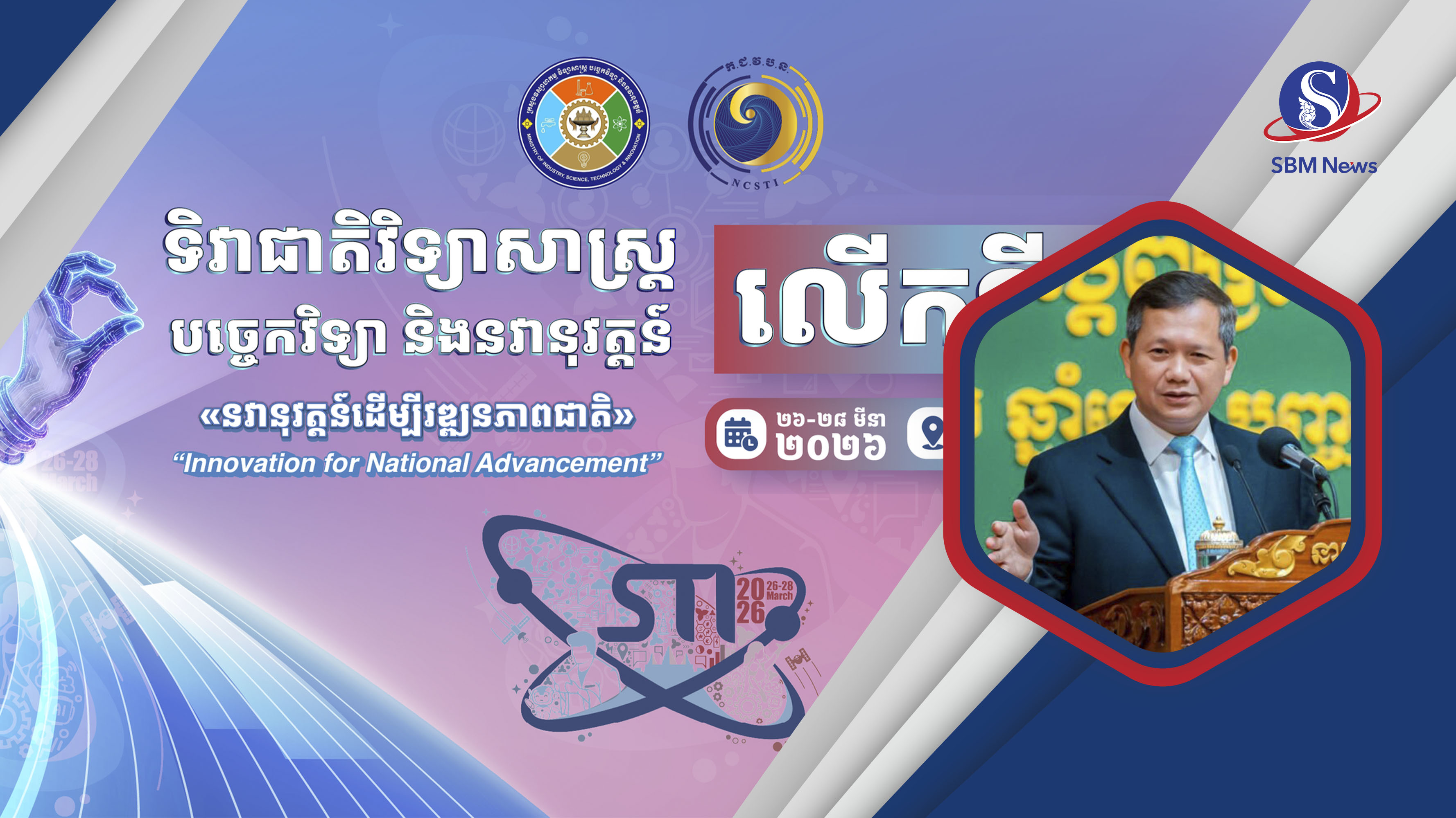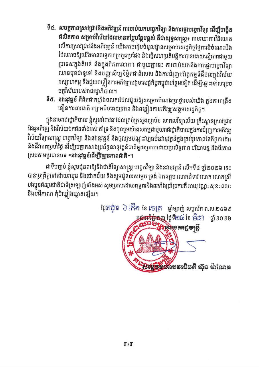 រាជធានីភ្នំពេញ៖ ក្នុងឱកាសប្រារព្ធទិវាជាតិវិទ្យាសាស្ត្រ បច្ចេកវិទ្យា និងនវានុវត្តន៍ លើកទី៤ ថ្ងៃទី២៦ ដល់ថ្ងៃទី២៨ ខែមីនា ឆ្នាំ២០២៦ សម្តេចនាយករដ្ឋមន្រ្តី ហ៊ុន ម៉ាណែត អំពាវនាវដល់សាកលវិទ្យាល័យ គ្រឹះស្ថានស្រាវជ្រាវ ដៃគូអភិវឌ្ឍ ក្រសួង និងវិស័យឯកជនទាំងអស់ ចូលរួមជាមួយរាជរដ្ឋាភិបាល ជំរុញការអភិវឌ្ឍ វិស័យវិទ្យាសាស្ត្រ បច្ចេកវិទ្យា និងនវានុវត្តន៍ ព្រមទាំងចូលរួមបណ្តុះវប្បធម៌នវានុវត្តន៍ ក្នុងគ្រប់រូបភាពនៃកិច្ចការងារ និងជីវភាពប្រចាំថ្ងៃ ដើម្បីរួមគ្នាកសាងប្រព័ន្ធនវានុវត្តន៍ជាតិមួយ ប្រកបដោយប្រសិទ្ធភាព។