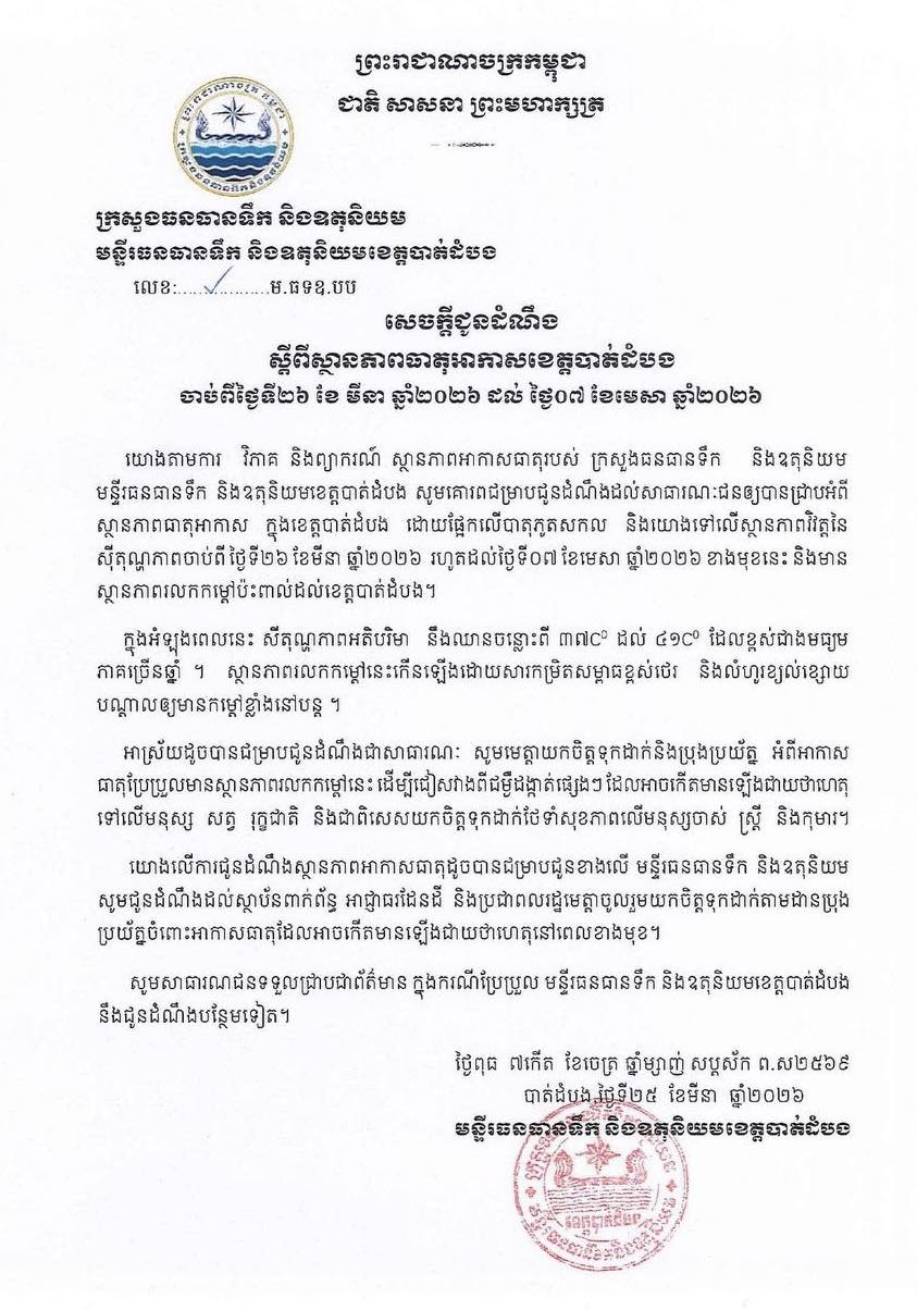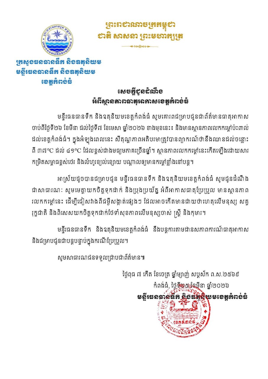 រាជធានីភ្នំពេញ៖ មន្ទីរធនធានទឹក និងឧតុនិយមខេត្តចំនួន៥ រួមមាន បាត់ដំបង កំពង់ធំ ស្ទឹងត្រែង ព្រះវិហារ និងត្បូងឃ្មុំ បានចេញសេចក្តីជូនដំណឹងព្រមៗគ្នា អំពីអាកាសធាតុដែលនឹងឡើងកម្ដៅខ្លាំង ចាប់ពីថ្ងៃទី២៦មីនា ដល់ថ្ងៃ៧មេសា ឆ្នាំ២០២៦។