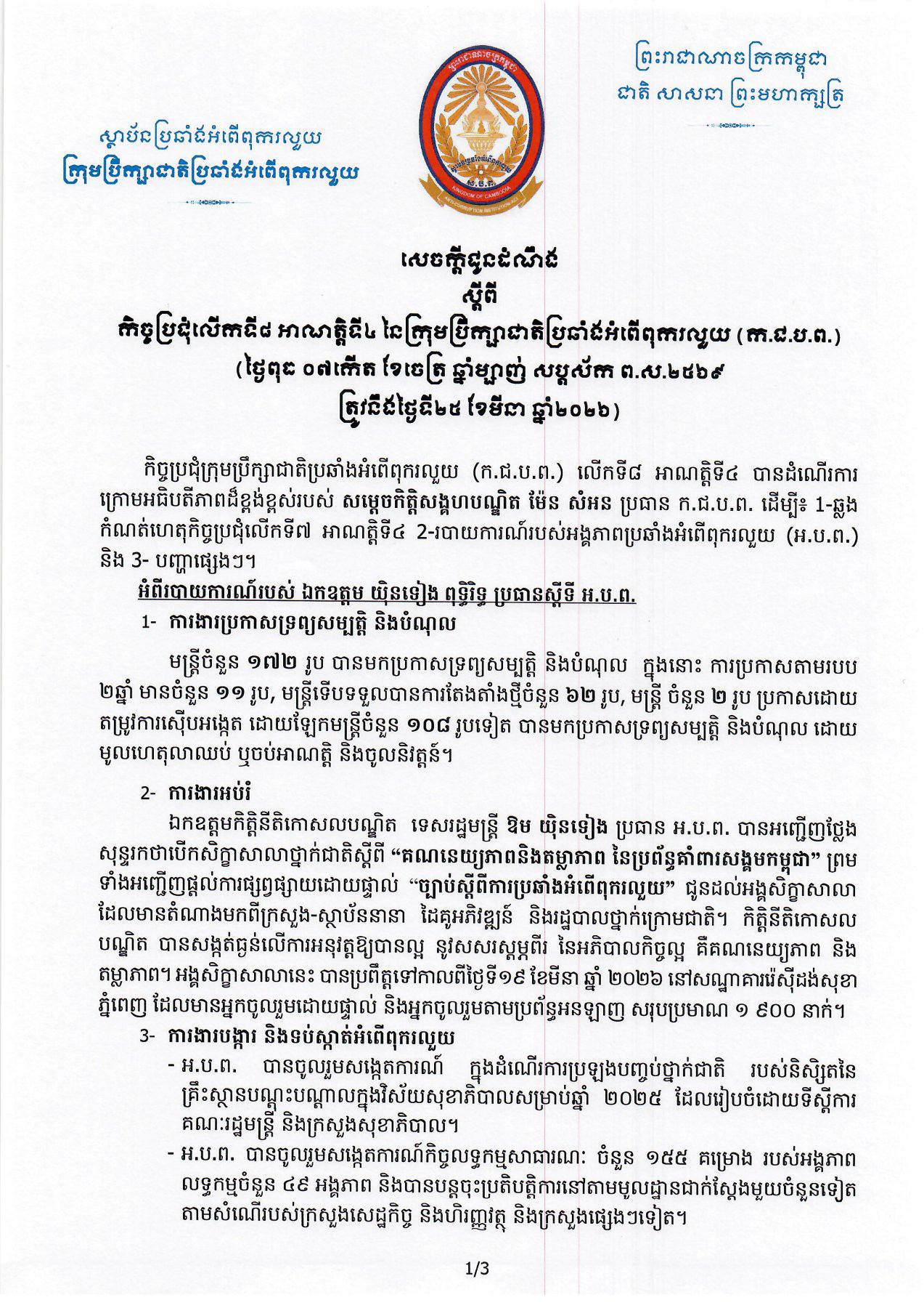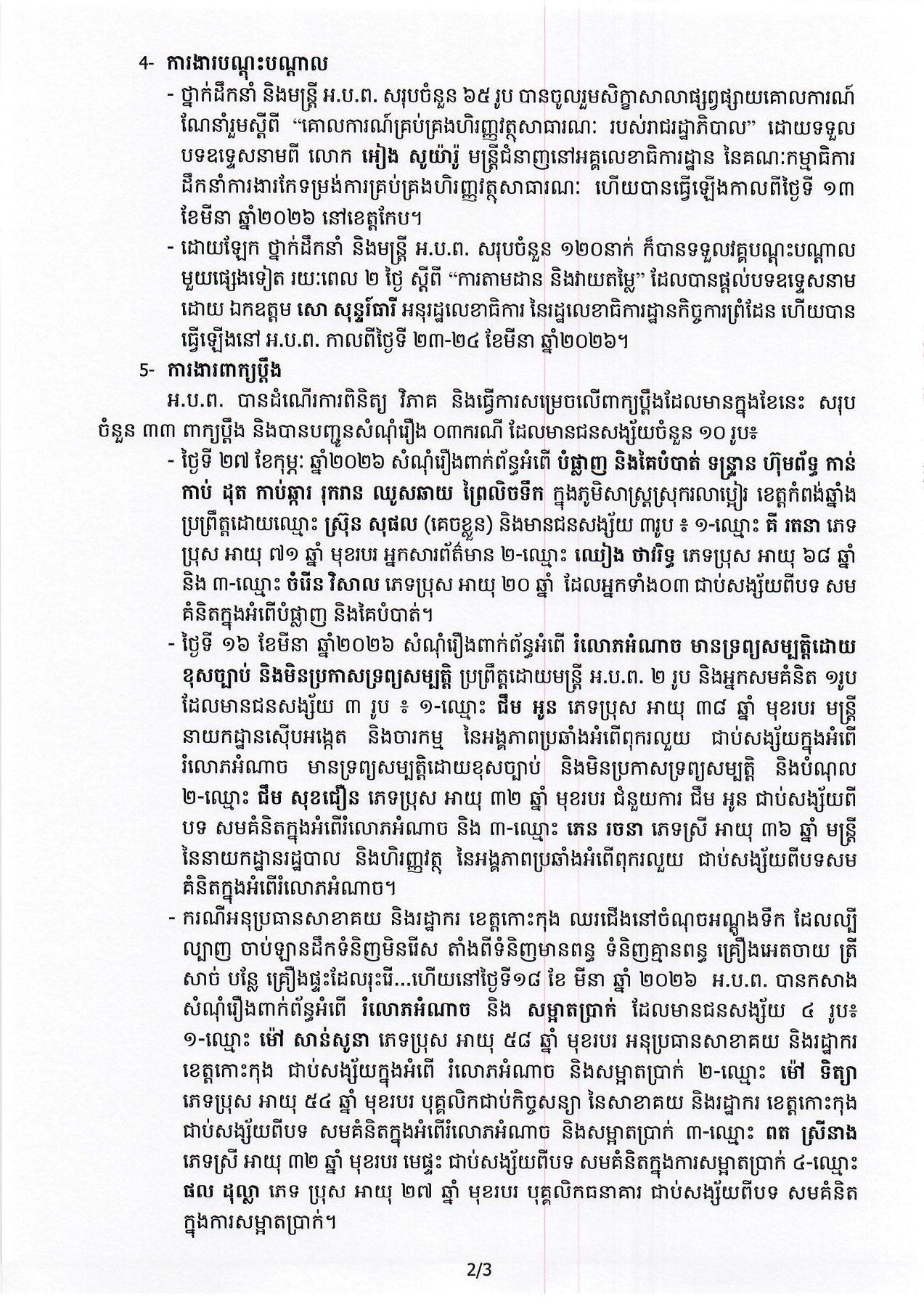 តាមរយៈសេចក្ដីប្រកាសជូនដំណឹង ស្ដីពីកិច្ចប្រជុំលើកទី៨ អាណត្តិទី៤ នៃក្រុមប្រឹក្សាជាតិប្រឆាំងអំពើពុករលួយ នៅថ្ងៃទី២៥ ខែមីនា ឆ្នាំ២០២៦ បានបង្ហាញថា ស្ថាប័នប្រឆាំងអំពើពុករលួយ ឬACU បានបើកការស៊ើបអង្កេតលើសំណុំរឿង រំលោភអំណាច មានទ្រព្យសម្បត្តិដោយខុសច្បាប់ និងមិនប្រកាសទ្រព្យសម្បត្តិ រហូតឈានដល់ការចាប់ខ្លួនមនុស្ស៣នាក់ ក្នុងនោះ មាន២នាក់ជាមន្ត្រីស្ថាប័នប្រឆាំងអំពើពុករលួយ និងម្នាក់ទៀតសមគំណិត។ អ្នកទាំងបីមានឈ្មោះដូចជា៖ ឈ្មោះ ជឹម អូន មន្ត្រីនាយកដ្ឋានស៊ើបអង្កេត និងចារកម្ម និងឈ្មោះ ភេន រចនា មន្រ្តីនៃនាយកដ្ឋានរដ្ឋបាល និងហិរញ្ញវត្ថុ ខណៈម្នាក់ទៀតឈ្មោះ ជឹម សុខជឿន (ជាជំនួយការឈ្មោះ ជឹម អូន)។
