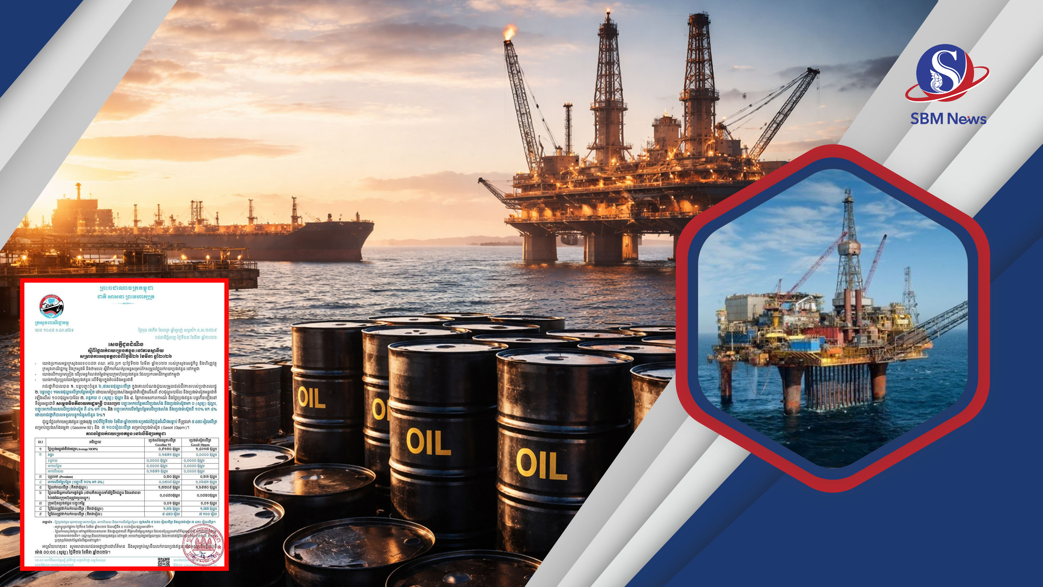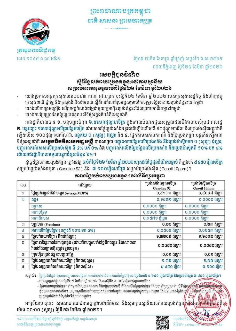 សូមបញ្ជាក់ថា គិតត្រឹមថ្ងៃទី២៦ ខែមីនា ឆ្នាំ២០២៦ ប្រេងម៉ាស៊ូតនៅកម្ពុជាមានតម្លៃ ៧១០០រៀលក្នុងមួយលីត្រ ហើយប្រេងសាំងធម្មតាមានតម្លៃ៥៤៥០រៀលក្នុងមួយលីត្រ ធ្វើតម្លៃប្រេងនៅកម្ពុជាបំបែកកំណត់ត្រា នេះបើយោងតាមក្រសួងពាណិជ្ជកម្ម។ តម្លៃប្រេងម៉ាស៊ូត៧១០០រៀលក្នុងមួយលីត្រ គឺជាបន្ទុកដ៏ធ្ងន់លើស្មារបស់ប្រជាកសិករ និងអាជីវករកម្ពុជា។ ក្នុងកាលៈទេសៈដែលពិភពលោកកំពុងស្ថិតក្នុងភ្នក់ភ្លើងសង្គ្រាម តម្លៃប្រេងនៅកម្ពុជា គឺជាការឆ្លុះបញ្ចាំងយ៉ាងពិតប្រាកដនៃវិបត្តិប្រេងសកល ខណៈរាជរដ្ឋាបាលកម្ពុជា កំពុងបង្ហាញពីកិច្ចខិតខំប្រឹងប្រែងយ៉ាងខ្លាំង ដើម្បីដោះស្រាយបញ្ហានេះ៕