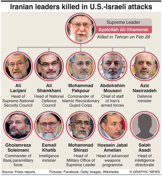 រាប់ចាប់ពីមេដឹកនាំកំពូលអ៊ីរ៉ង់ លោក អាយ៉ាតូឡាហ៍ អាលី ខាមេណេ (Ayatollah Ali Khamenei) មានវ័យ៨៦ឆ្នាំ និងកាន់អំណាចជាង៣ទសវត្សរ៍ ត្រូវបានសម្លាប់ដោយការវាយប្រហារតាមអាកាសរបស់អាម៉េរិក-អ៊ីស្រាអែល កាលពីថ្ងៃទី២៨ ខែកុម្ភៈ (ជាថ្ងៃដំបូងនៃការផ្ទុះសង្គ្រាម)។ លេខាធិការនៃក្រុមប្រឹក្សាសន្តិសុខជាតិកំពូល និងជាអ្នកនយោបាយជើងចាស់ លោក អាលី ឡារីហ្សានី (Ali Larijani) ក៏ត្រូវបានសម្លាប់ក្នុងវ័យ៦៧ឆ្នាំ។ លើសពីនេះ ការវាយប្រហាររួមគ្នារបស់អាម៉េរិក-អ៊ីស្រាអែល ក៏បានផ្តាច់ជីវិតលោក អេសម៉ាអ៊ីល ខាទីប (Esmail Khatib) រដ្ឋមន្ត្រីក្រសួងស៊ើបការណ៍សម្ងាត់អ៊ីរ៉ង់, លោក អាលី សាំខានី (Ali Shamkhani) ទីប្រឹក្សាជំនិតរបស់លោក ខាមេណេ និងជាបុគ្គលសំខាន់ក្នុងគោលនយោបាយនុយក្លេអ៊ែរ, លោក ម៉ូហាំម៉ាត់ ប៉ាក់ពួរ (Mohammad Pakpour) អគ្គមេបញ្ជាការនៃកងកម្លាំងឆ្មាំបដិវត្តន៍អ៊ិស្លាម, លោក អាហ្ស៊ីស ណាស៊ីហ្សឺដេហ៍ (Aziz Nasirzadeh) រដ្ឋមន្ត្រីការពារជាតិ, លោក អាប់ឌុលរ៉ាហ៊ីម មូសាវី (Abdolrahim Mousavi) អគ្គសេនាធិការនៃកងកម្លាំងប្រដាប់អាវុធ, លោក ហ្គោឡាមរ៉េហ្សា សូឡីម៉ានី (Gholamreza Soleimani) មេបញ្ជាការកងកម្លាំងបាស៊ីជ, និងលោក បេហ៍ណាម រ៉េហ្សៃ (Behnam Rezaei) ប្រធានផ្នែកស៊ើបការណ៍សម្ងាត់ជើងទឹកនៃកងឆ្មាំបដិវត្តន៍។ ក្រៅពីនេះ ក៏មានមេដឹកនាំយោធាអ៊ីរ៉ង់ផ្សេងៗជាច្រើនរូបទៀត ដែលត្រូវបានផ្តាច់ជីវិតក្រោមកណ្តាប់ដៃអាម៉េរិក និងអ៊ីស្រាអែល៕