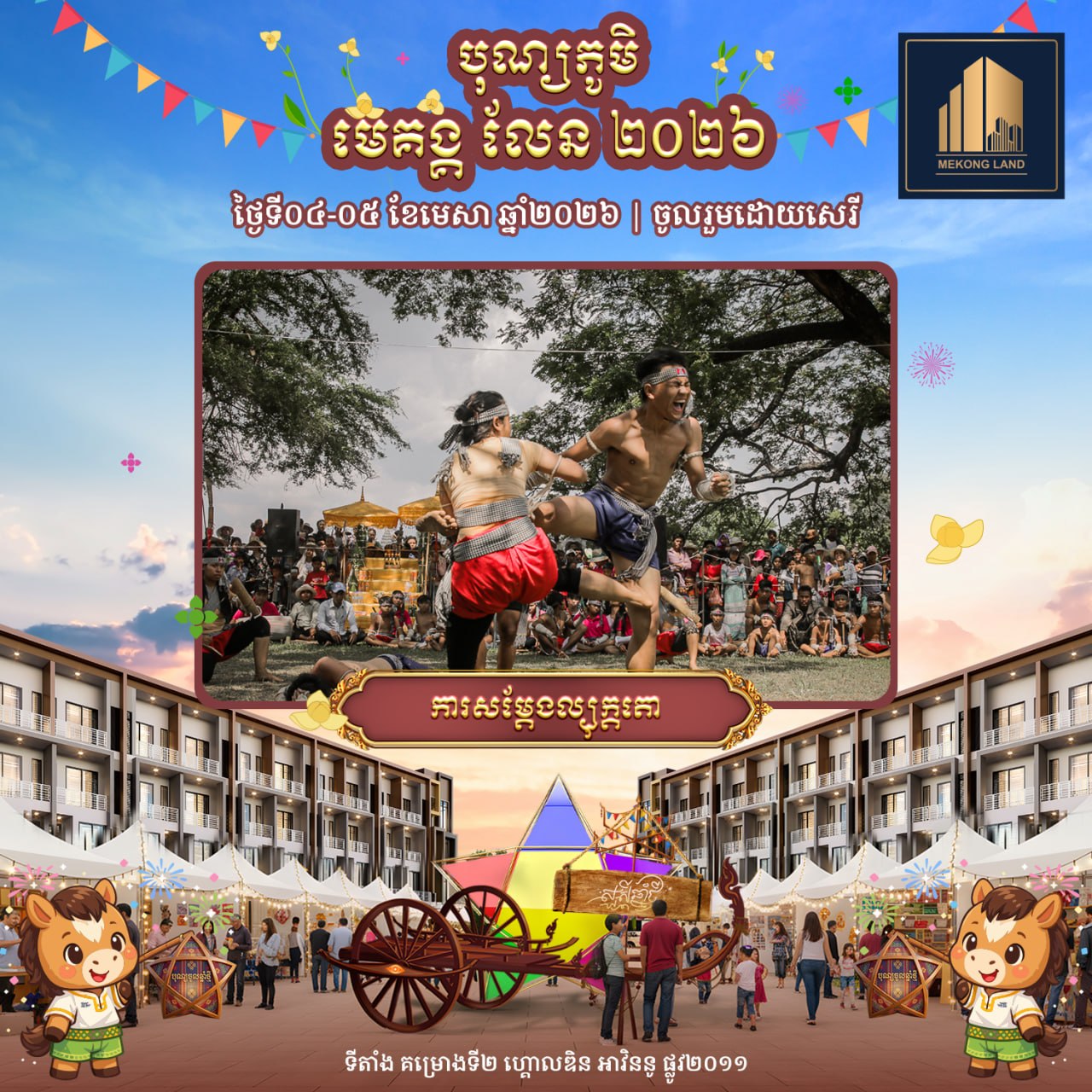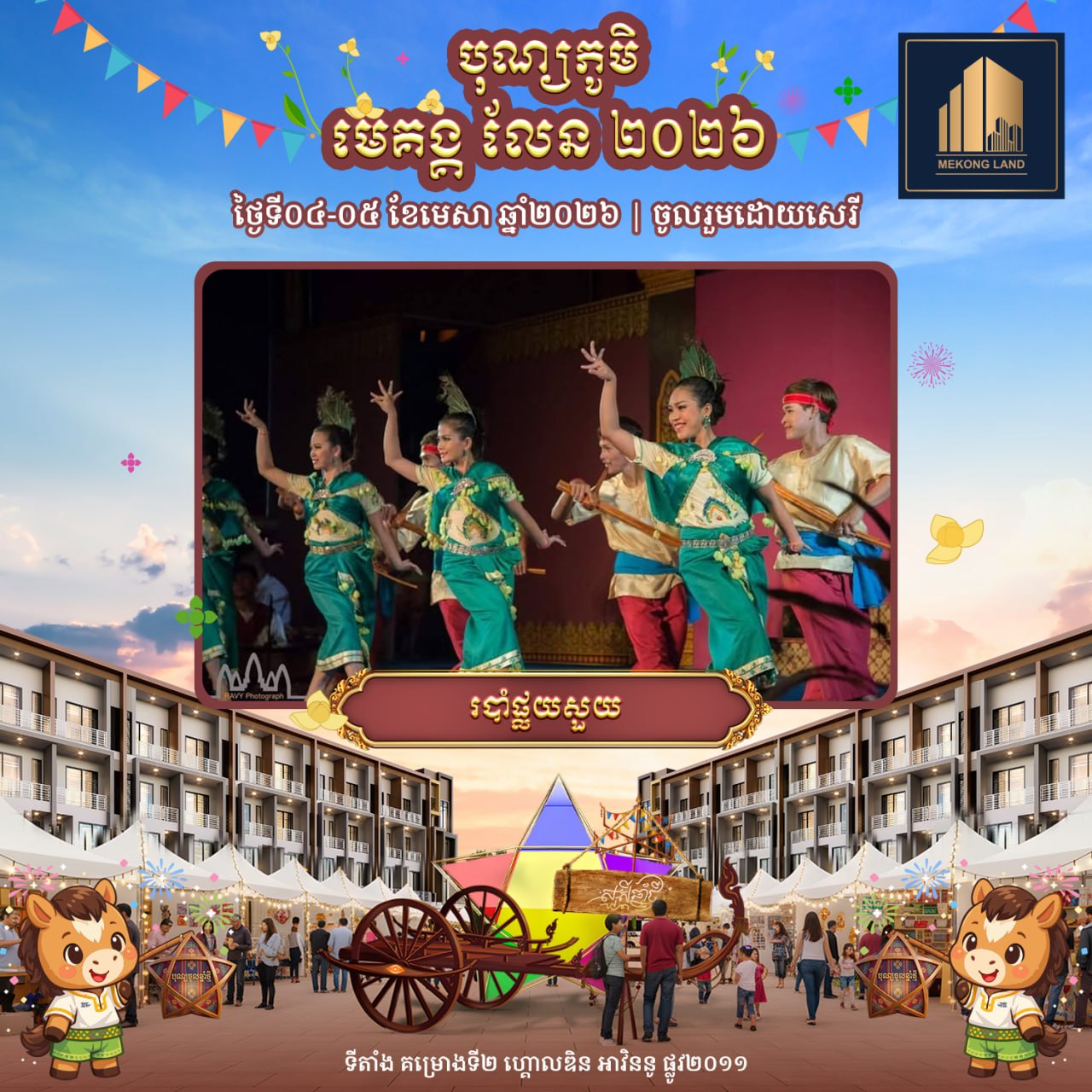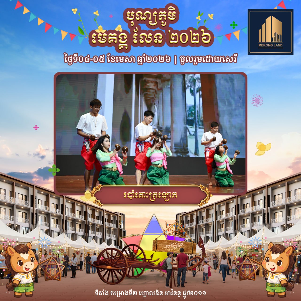 បុណ្យភូមិ មេគង្គ លែន ២០២៦ នឹងរៀបចំឡើងនៅក្នុងគម្រោង «ហ្គោលឌិន អាវិននូ» (Golden Avenue) ស្ថិតតាមបណ្តោយផ្លូវ២០១១ សង្កាត់គោករការ ខណ្ឌព្រែកព្នៅ រាជធានីភ្នំពេញ ចាប់ពីម៉ោង៩ព្រឹករហូតដល់ម៉ោង៩យប់ ដោយបើកជូនសាធារណជនចូលរួមដោយសេរី និងឥតគិតថ្លៃ។ បុណ្យភូមិ មេគង្គ លែន ២០២៦ នឹងនាំមកនូវទស្សនីយភាពអស្ចារ្យជាច្រើនរួមមាន៖ ការសម្ដែងរបាំប្រពៃណីខ្មែរល្បីៗដូចជា៖ របាំត្រុដិ, របាំគោះត្រឡោក, របាំសុវណ្ណមច្ឆា, គុនល្បុក្កតោ និងរបាំផ្លយសួយ។ បន្ថែមពីនេះ ក៏មានការលេងល្បែងប្រជាប្រិយខ្មែរ ការថតរូបសន្លឹកអនុស្សាវរីយ៍ និងការប្រគំតន្ត្រីនាពេលល្ងាច ដើម្បីបង្កើនភាពសប្បាយរីករាយទ្វេដង។ ជាពិសេស នៅថ្ងៃទី៤ ខែមេសា ចាប់ពីម៉ោង២រសៀលតទៅ នឹងមានការសម្ដែង «របាំត្រុដិ» ដែលជារបាំបុរាណខ្មែរដ៏មានអត្ថន័យ ក្នុងគោលបំណងបណ្ដេញនូវរាល់ឧបទ្រពចង្រៃនៃឆ្នាំចាស់ និងនាំមកនូវសិរិសួស្ដី ជោគជ័យ សុភមង្គល ជូនដល់ម្ចាស់គេហដ្ឋាន និងអាជីវករទាំងអស់នៅក្នុងគម្រោង ហ្គោលឌិន អាវិននូ ក៏ដូចជាភ្ញៀវកិត្តិយសដែលបានចូលរួមផងដែរ។
