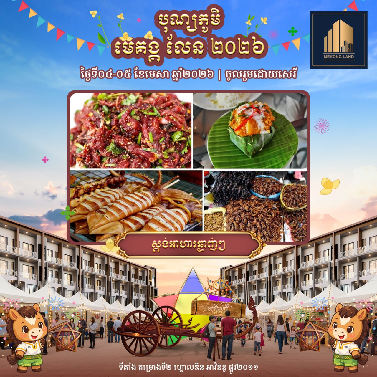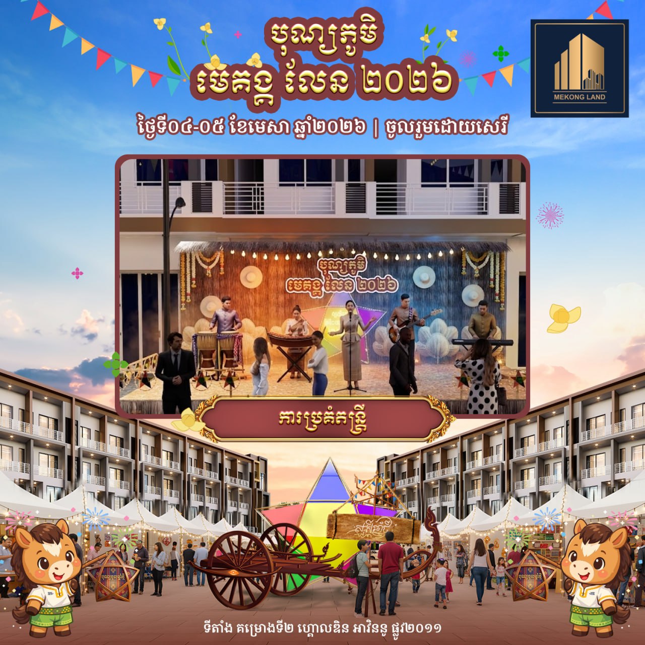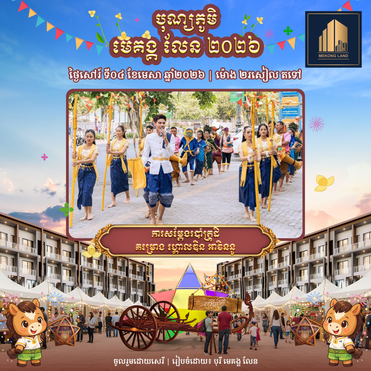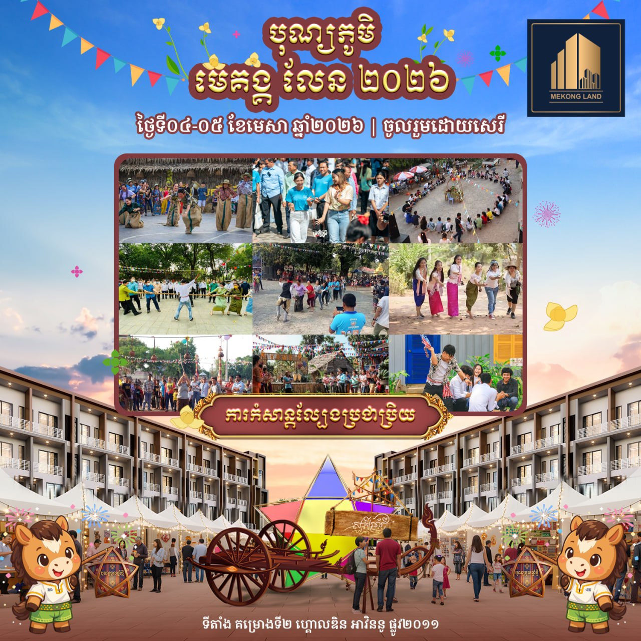 បុណ្យភូមិ មេគង្គ លែន ២០២៦ នឹងរៀបចំឡើងនៅក្នុងគម្រោង «ហ្គោលឌិន អាវិននូ» (Golden Avenue) ស្ថិតតាមបណ្តោយផ្លូវ២០១១ សង្កាត់គោករការ ខណ្ឌព្រែកព្នៅ រាជធានីភ្នំពេញ ចាប់ពីម៉ោង៩ព្រឹករហូតដល់ម៉ោង៩យប់ ដោយបើកជូនសាធារណជនចូលរួមដោយសេរី និងឥតគិតថ្លៃ។ បុណ្យភូមិ មេគង្គ លែន ២០២៦ នឹងនាំមកនូវទស្សនីយភាពអស្ចារ្យជាច្រើនរួមមាន៖ ការសម្ដែងរបាំប្រពៃណីខ្មែរល្បីៗដូចជា៖ របាំត្រុដិ, របាំគោះត្រឡោក, របាំសុវណ្ណមច្ឆា, គុនល្បុក្កតោ និងរបាំផ្លយសួយ។ បន្ថែមពីនេះ ក៏មានការលេងល្បែងប្រជាប្រិយខ្មែរ ការថតរូបសន្លឹកអនុស្សាវរីយ៍ និងការប្រគំតន្ត្រីនាពេលល្ងាច ដើម្បីបង្កើនភាពសប្បាយរីករាយទ្វេដង។ ជាពិសេស នៅថ្ងៃទី៤ ខែមេសា ចាប់ពីម៉ោង២រសៀលតទៅ នឹងមានការសម្ដែង «របាំត្រុដិ» ដែលជារបាំបុរាណខ្មែរដ៏មានអត្ថន័យ ក្នុងគោលបំណងបណ្ដេញនូវរាល់ឧបទ្រពចង្រៃនៃឆ្នាំចាស់ និងនាំមកនូវសិរិសួស្ដី ជោគជ័យ សុភមង្គល ជូនដល់ម្ចាស់គេហដ្ឋាន និងអាជីវករទាំងអស់នៅក្នុងគម្រោង ហ្គោលឌិន អាវិននូ ក៏ដូចជាភ្ញៀវកិត្តិយសដែលបានចូលរួមផងដែរ។