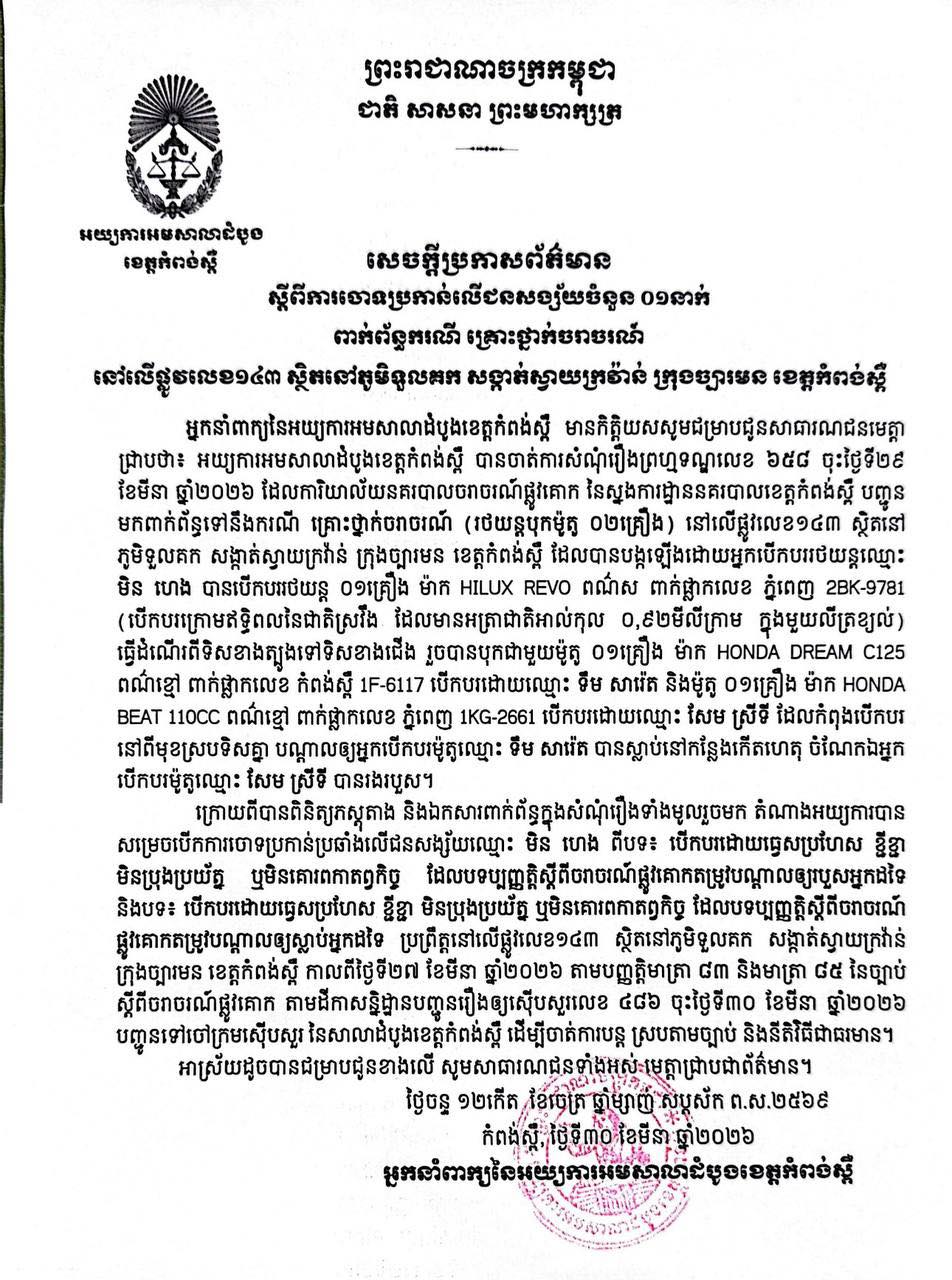 កំពង់ស្ពឺ៖ អយ្យការអមសាលាដំបូងខេត្តកំពង់ស្ពឺ បានចោទប្រកាន់លោក មិន ហេង ស្មៀនឃុំតាសាល ស្រុកឱរ៉ាល់ ខេត្តកំពង់ស្ពឺ ពីបទបើកបរក្នុងស្ថានភាពស្រវឹងបង្កគ្រោះថ្នាក់ឱ្យអ្នកដទៃស្លាប់ និងរបួស។ នេះបើតាមសេចក្តីប្រកាសព័ត៌មានរបស់អយ្យការចេញនៅថ្ងៃទី៣១ ខែមីនា ឆ្នាំ២០២៦។