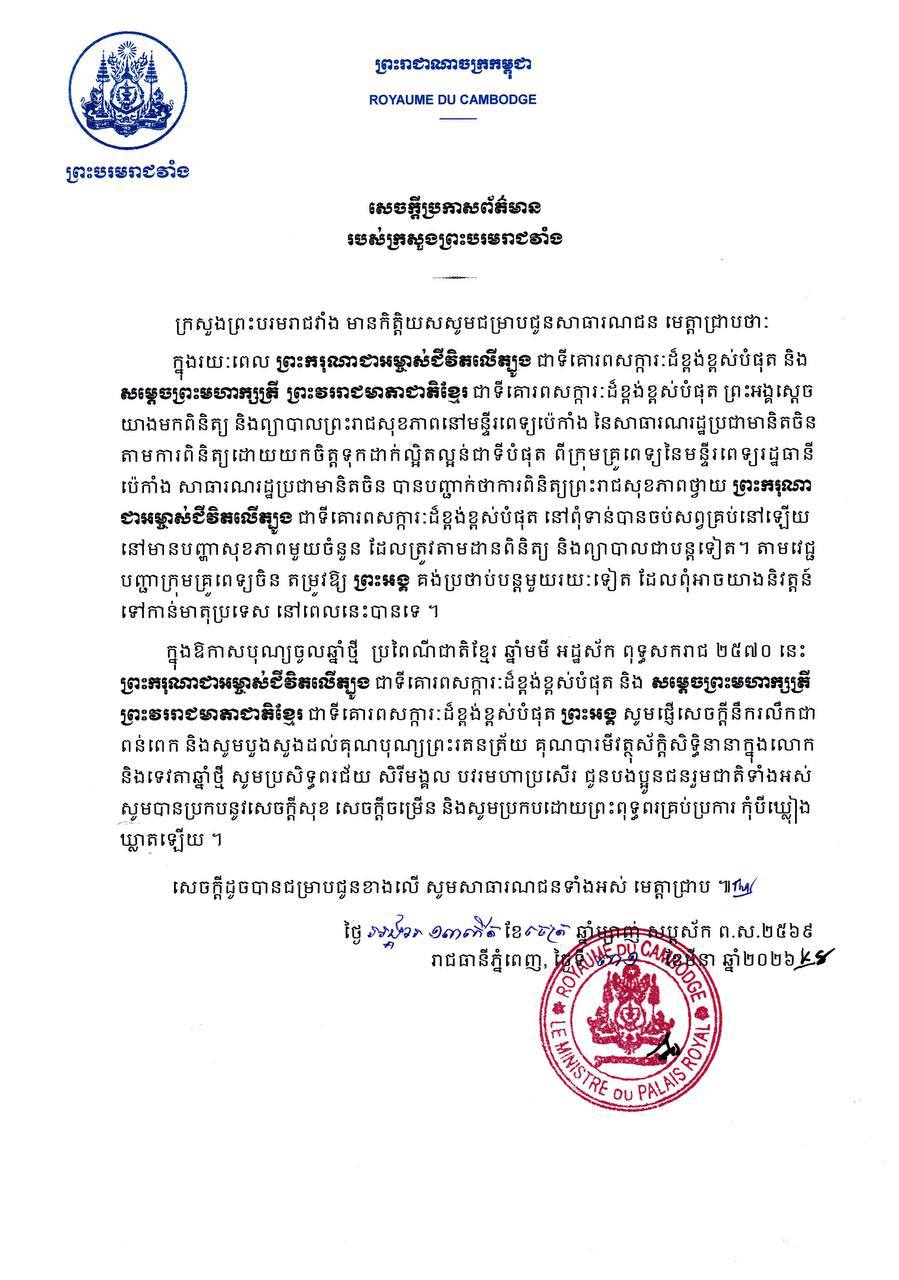 រាជធានីភ្នំពេញ៖ ព្រះករុណា ព្រះបាទសម្តេច ព្រះបរមនាថ នរោត្តម សីហមុនី ព្រះមហាក្សត្សកម្ពុជា និងសម្ដេចព្រះមហាក្សត្រី នរោត្តម មុនិនាថ សីហនុ ព្រះវររាជមាតាជាតិខ្មែរ មិនទាន់អាចយាងមកមាតុភូមិវិញតាមកាលកំណត់នោះទេ ដោយទ្រង់ទាំងទ្វេ ត្រូវបន្តគង់ប្រថាប់នៅរដ្ឋធានីប៉េកាំង ប្រទេសចិន ដើម្បីតាមដានព្រះរាជសុខភាពបន្ថែមទៀត។
