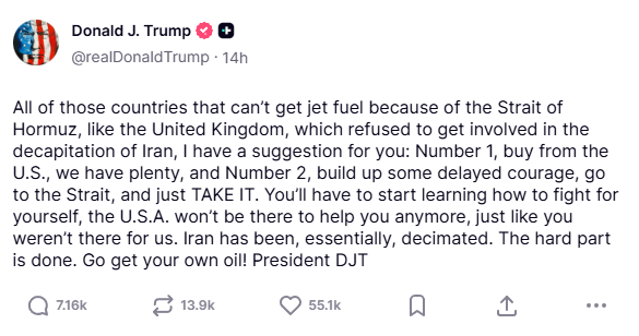 ជាក់ស្តែង ថ្ងៃចុងក្រោយនៃខែមីនា លោក ត្រាំ បានយកដៃទាញដងប៉ាការសរសេរសារដ៏មុតស្រួចមួយផ្តាំទៅសម្ព័ន្ធមិត្តថា៖«សម្រាប់បណ្តាប្រទេសទាំងអស់ ដែលមិនអាចទទួលបានប្រេងឥន្ធនៈយន្តហោះ ដោយសារតែបញ្ហានៅច្រកសមុទ្ទហ័រមូស្ស ដូចជាចក្រភពអង់គ្លេស ដែលបានបដិសេធមិនចូលរួមក្នុងប្រតិបត្តិការកម្ចាត់អ៊ីរ៉ង់ ខ្ញុំមានយោបល់សម្រាប់អ្នក៖ ទី១,ទិញពីសហរដ្ឋអាម៉េរិកទៅ យើងមានច្រើនណាស់ និងទី២, បង្កើនភាពក្លាហានរបស់អ្នកខ្លះទៅ រួចធ្វើដំណើរទៅកាន់ច្រកសមុទ្ទនោះ ហើយដណ្តើមយកវាទៅ។ អ្នកត្រូវតែចាប់ផ្តើមរៀនពីរបៀបតស៊ូដើម្បីខ្លួនឯង។ សហរដ្ឋអាម៉េរិក នឹងមិននៅទីនោះដើម្បីជួយអ្នកទៀតទេ ដូចដែលអ្នកមិនបាននៅទីនោះសម្រាប់ជួយយើងដែរ។ តាមពិតទៅ អ៊ីរ៉ង់ត្រូវបានកម្ទេចស្ទើរតែទាំងស្រុងទៅហើយ។ កន្លែងដែលពិបាកបំផុតបានបញ្ចប់អស់ហើយ។ ទៅរកប្រេងដោយខ្លួនឯងទៅ»។