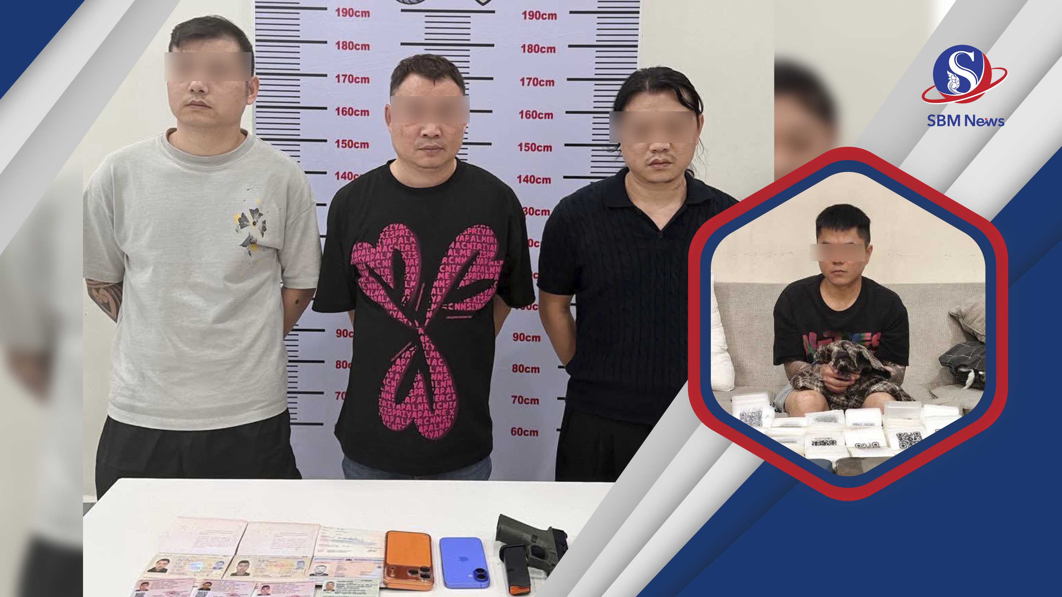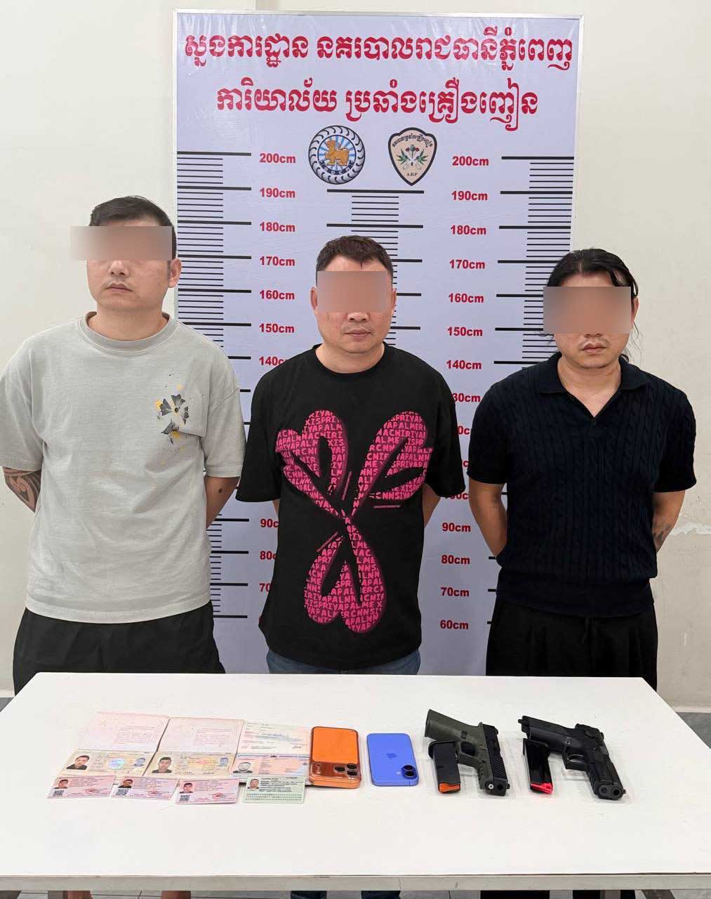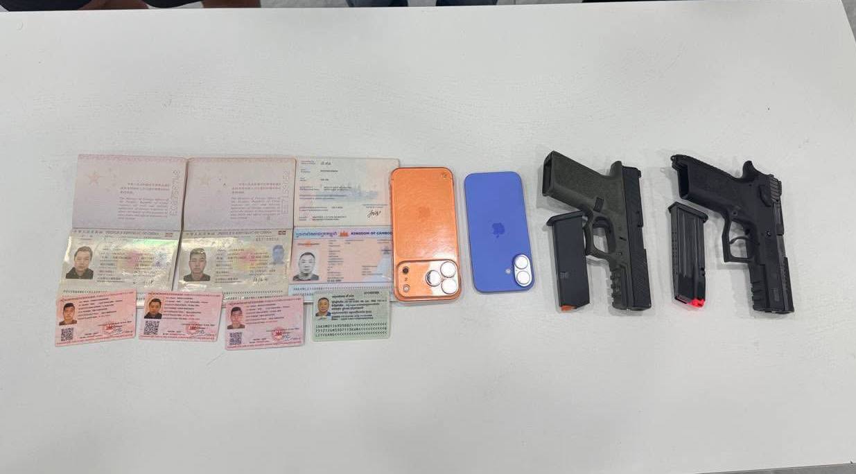 រាជធានីភ្នំពេញ៖ បុរសជនជាតិចិន៤នាក់ ត្រូវបានកម្លាំងសមត្ថកិច្ចចាប់ខ្លួន ក្នុងភូមិសាស្ត្រខណ្ឌសែនសុខ រាជធានីភ្នំពេញ កាលពីថ្ងៃទី៣១ ខែមីនា ឆ្នាំ២០២៦ ខណៈកាំភ្លើងខ្លី២ដើម និងថ្នាំញៀនមួយចំនួនធំ ក៏ត្រូវបានរឹបអូសផងដែរ...។