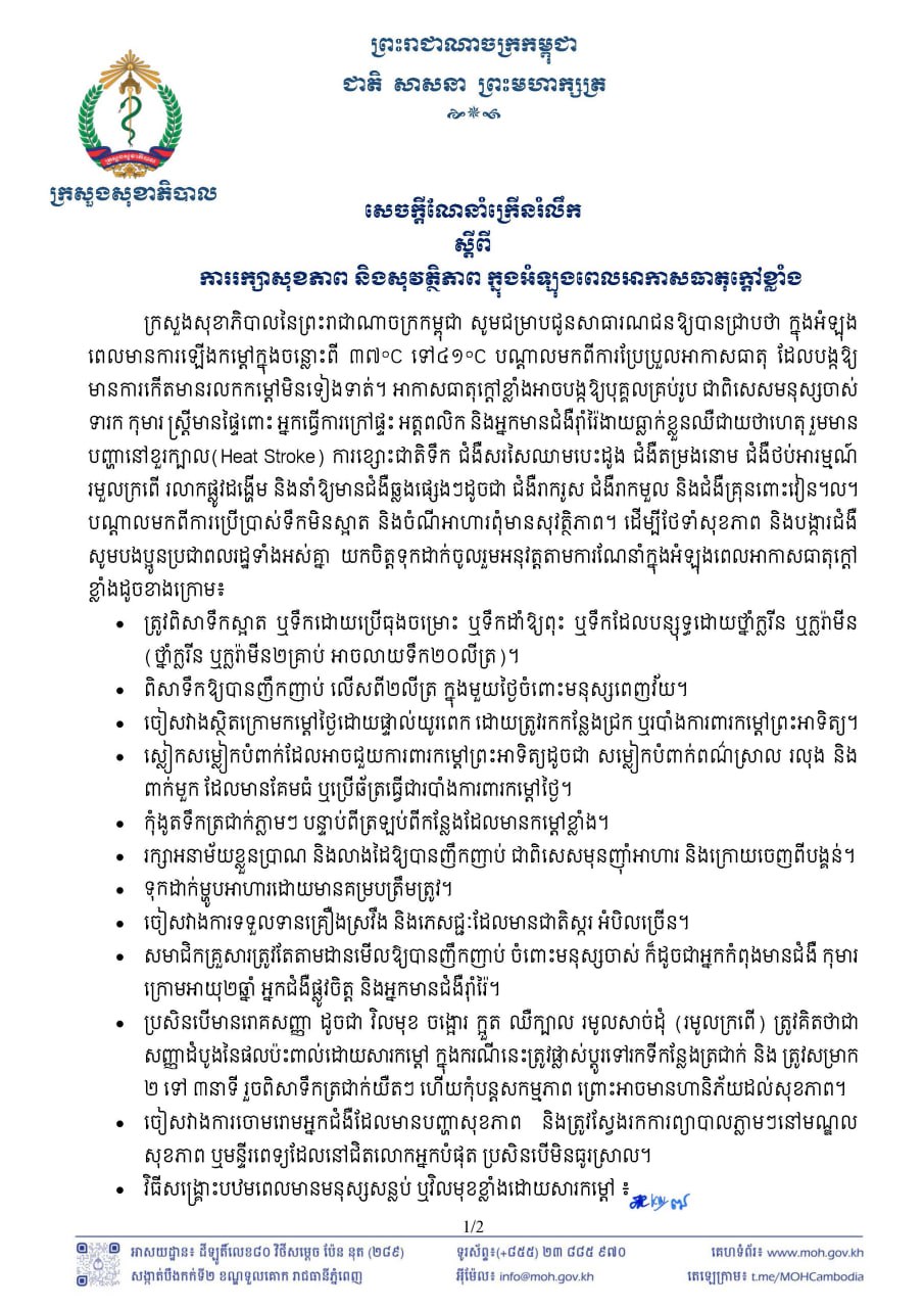 សេចក្ដីណែនាំក្រសួងសុខាភិបាល ចេញនៅយប់ថ្ងៃទី២ ខែមេសា ឆ្នាំ២០២៦ បានឱ្យដឹងថា អាកាសធាតុក្ដៅខ្លាំង អាចបង្កឱ្យមនុស្សគ្រប់រូប ជាពិសេស មនុស្សចាស់ ទារក កុមារ ស្ត្រីមានផ្ទៃពោះ អ្នកធ្វើការក្រៅផ្ទះ អត្តពលិក និងអ្នកមានជំងឺរ៉ាំរ៉ៃ ងាយធ្លាក់ខ្លួនឈឺជាយថាហេតុ រួមមាន៖ បញ្ហានៅខួរក្បាល, ការខ្សោះជាតិទឹក, ជំងឺសរសៃឈាមបេះដូង, ជំងឺតម្រងនោម, ជំងឺថប់អារម្មណ៍, រមួលក្រពើ, រលាកផ្លូវដង្ហើម, រាករូស និងជំងឺគ្រុនពោះវៀន។ល។ ដូច្នេះ ដើម្បីថែទាំសុខភាព ចៀសឆ្ងាយពីជំងឺផ្សេងៗ ក្រសួងណែនាំឱ្យពលរដ្ឋពិសាទឹកស្អាតឱ្យបានញឹកញាប់ លើសពី២លីត្រក្នុង១ថ្ងៃចំពោះមនុស្សពេញវ័យ។ ចៀសវាងនៅក្រោមកម្ដៅថ្ងៃដោយផ្ទាល់យូរពេក ហើយត្រូវស្លៀកសម្លៀកបំពាក់ពណ៌ស្រាល រលុង និងពាក់មួកដែលមានគែមធំ ឬប្រើឆត្រ។
