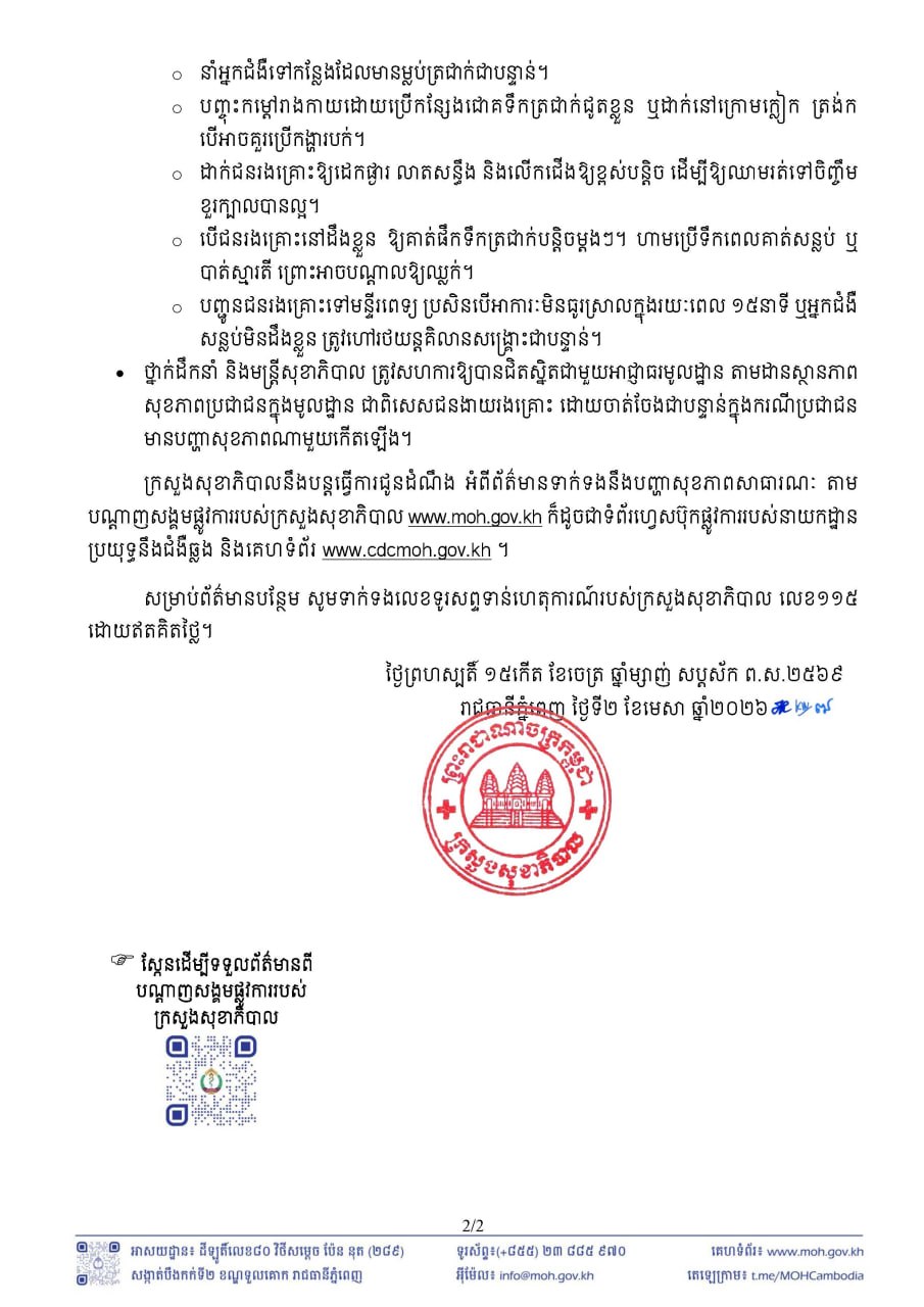 ចៀសវាងការចោមរោមអ្នកជំងឺដែលមានបញ្ហាសុខភាព និងត្រូវស្វែងរកការព្យាបាលភ្លាមៗនៅមណ្ឌលសុខភាព ឬមន្ទីរពេទ្យដែលនៅជិតលោកអ្នកបំផុត ប្រសិនបើមិនធូរស្រាល។ ក្រសួងសុខាភិបាល ក៏បានណែនាំដល់ថ្នាក់ដឹកនាំ និងមន្ត្រីសុខាភិបាលទាំងអស់ ត្រូវសហការឱ្យបានជិតស្និតជាមួយអាជ្ញាធរមូលដ្ឋាន តាមដានស្ថានភាពសុខភាពប្រជាជនក្នុងមូលដ្ឋាន ជាពិសេសជនងាយរងគ្រោះ ដោយចាត់ចែងជាបន្ទាន់ក្នុងករណីប្រជាជនមានបញ្ហាសុខភាពណាមួយកើតឡើង៕