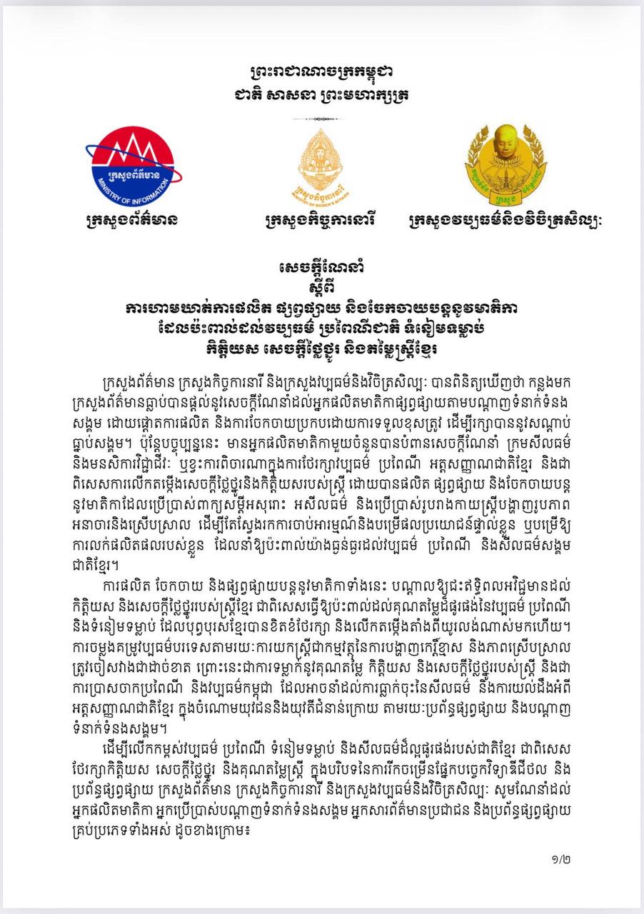 តាមរយៈសេចក្តីណែនាំរួម ក្រសួងទាំង៣ បានក្រើនរំឭកថា អ្នកផលិតមាតិកាត្រូវបញ្ឈប់ការផលិត ផ្សព្វផ្សាយ និងចែកចាយបន្ត នូវសារជាអក្សរ សំឡេង វីដេអូ ឬ មាតិកាទាំងឡាយណា ដែលប្រើប្រាស់ពាក្យសម្តីអសុរោះ ជេរប្រមាថ បង្ហាញកេរ្តិ៍ខ្មាស និងភាពស្រើបស្រាល ដូចជា ការស្លៀកពាក់ខើចលើខើចក្រោមជ្រុលហួសហេតុពេក កាយវិការត្រាប់តាមសកម្មភាពអាសអាភាស និងអំពើហិង្សាផ្ទុយនឹងសីលធម៌ប្រពៃណីខ្មែរ។ ជាមួយគ្នា អ្នកសារព័ត៌មាន អ្នកប្រើប្រាស់បណ្តាញទំនាក់ទំនងសង្គម អ្នកសារព័ត៌មានប្រជាជន ត្រូវប្រកាន់ខ្ជាប់នូវក្រមសីលធម៌ វិជ្ជាជីវៈសារព័ត៌មាន គោរពច្បាប់ជាធរមាន ដោយមិនត្រូវផលិត និងចែករំលែកបន្ត ពីមាតិកាណាដែលជះឥទ្ធិពលអវិជ្ជមានដល់តម្លៃស្ត្រី។