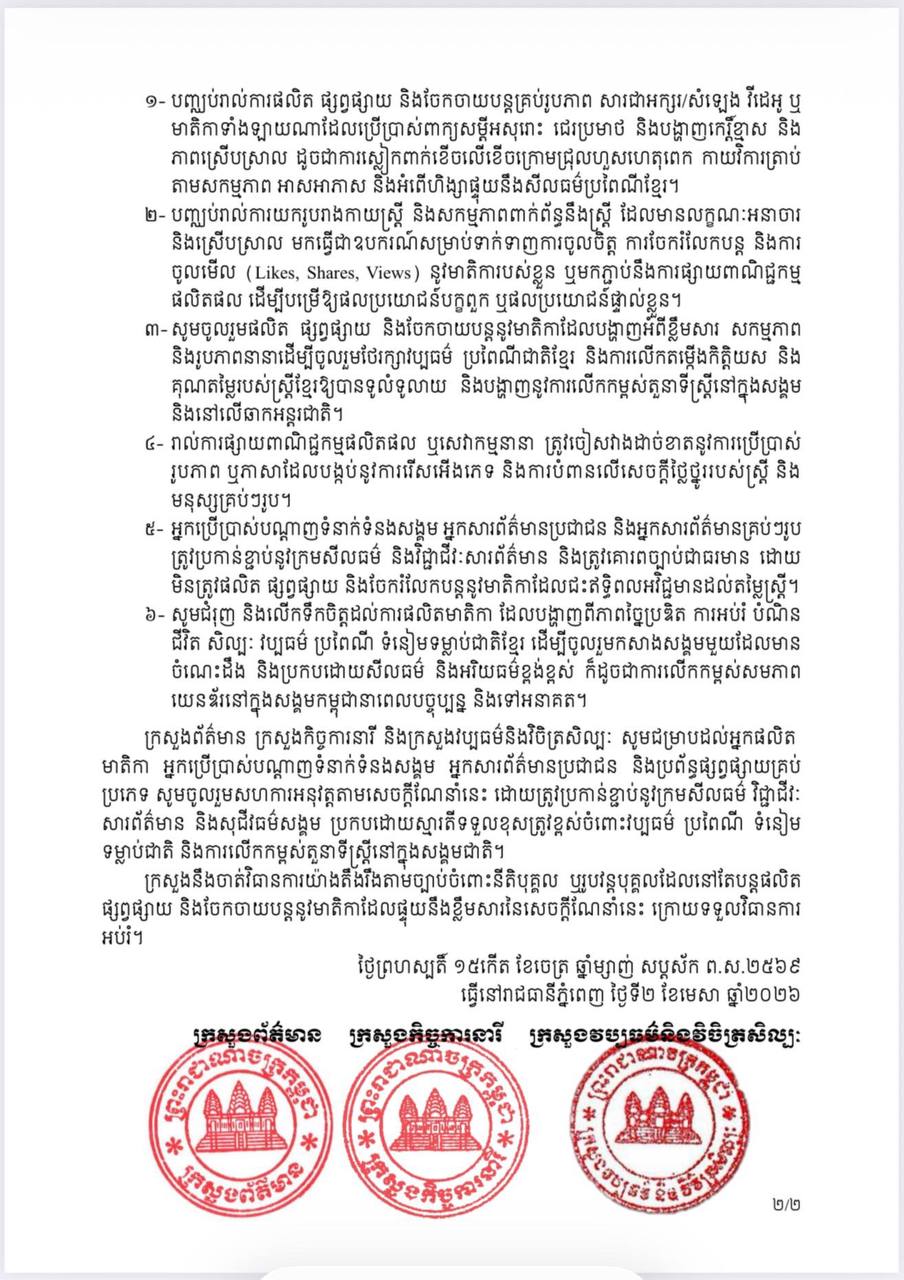 រាជធានីភ្នំពេញ៖ ក្រសួងព័ត៌មាន ក្រសួងកិច្ចការនារី និងក្រសួងវប្បធម៌ កាលពីថ្ងៃទី២ ខែមេសា ឆ្នាំ២០២៦ បានចេញសេចក្តីណែនាំរួម ក្រើនរំឮកអ្នកផលិតមាតិកា ត្រូវបញ្ឈប់រាល់ការផលិតគ្រប់រូបភាព ពីសកម្មភាពស្រី្តដែលមានលក្ខណៈអនាចារ និងស្រើបស្រាល ដើម្បីទាក់ទាញឱ្យមានអ្នកមើល និងចែករំលែកបន្តច្រើន។ ករណីមិនស្តាប់តាមការណែនាំ ក្រសួង នឹងចាត់វិធានការតាមផ្លូវច្បាប់ដោយគ្មានការលើកលែង។