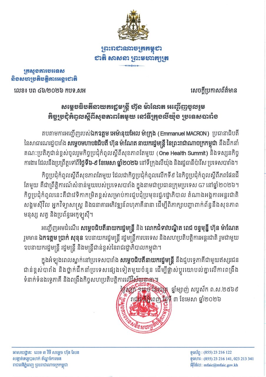 បើតាមក្រសួងការបរទេស គណៈប្រតិភូជាន់ខ្ពស់កម្ពុជា ចូលរួមកិច្ចប្រជុំកំពូលស្តីពីសុខភាពតែមួយ (One Health Summit) និងធ្វើទស្សនកិច្ចការងារពីថ្ងៃទី៦ ដល់ថ្ងៃទី៩ ខែមេសា នៅទីក្រុងលីយ៉ុង និងរដ្ឋធានីប៉ារីស ប្រទេសបារាំង។ ដំណើរទស្សនកិច្ចរបស់ប្រមុខរាជរដ្ឋាភិបាលកម្ពុជា ធ្វើឡើងតបតាមការអញ្ជើញរបស់លោក អេម៉ានូអែល ម៉ាក្រុង (Emmanuel Macron) ប្រធានាធិបតីបារាំង។ ក្រសួងការបរទេស បានឱ្យដឹងថា កិច្ចប្រជុំស្តីពីសុខភាពតែមួយ ជាកិច្ចប្រជុំកំពូលលើកទី៩ និងជាព្រឹត្តិការណ៍សំខាន់របស់ប្រទេសបារាំង ក្នុងនាមជាប្រធានក្រុមប្រទេស G7 នៅឆ្នាំ២០២៦។ កិច្ចប្រជុំកំពូលនេះ គឺជាវេទិកាកម្រិតខ្ពស់សម្រាប់ការជួបជុំប្រមុខរដ្ឋ-ប្រមុខរដ្ឋាភិបាល តំណាងអង្គការអន្តរជាតិ សង្គមស៊ីវិល អ្នកវិទ្យាសាស្ត្រ និងធនាគារអភិវឌ្ឍន៍ពហុភាគីនានា ដើម្បីពិភាក្សាបញ្ហាពាក់ព័ន្ធនឹងសុខភាពមនុស្ស សត្វ និងប្រព័ន្ធអេកូឡូស៊ី។