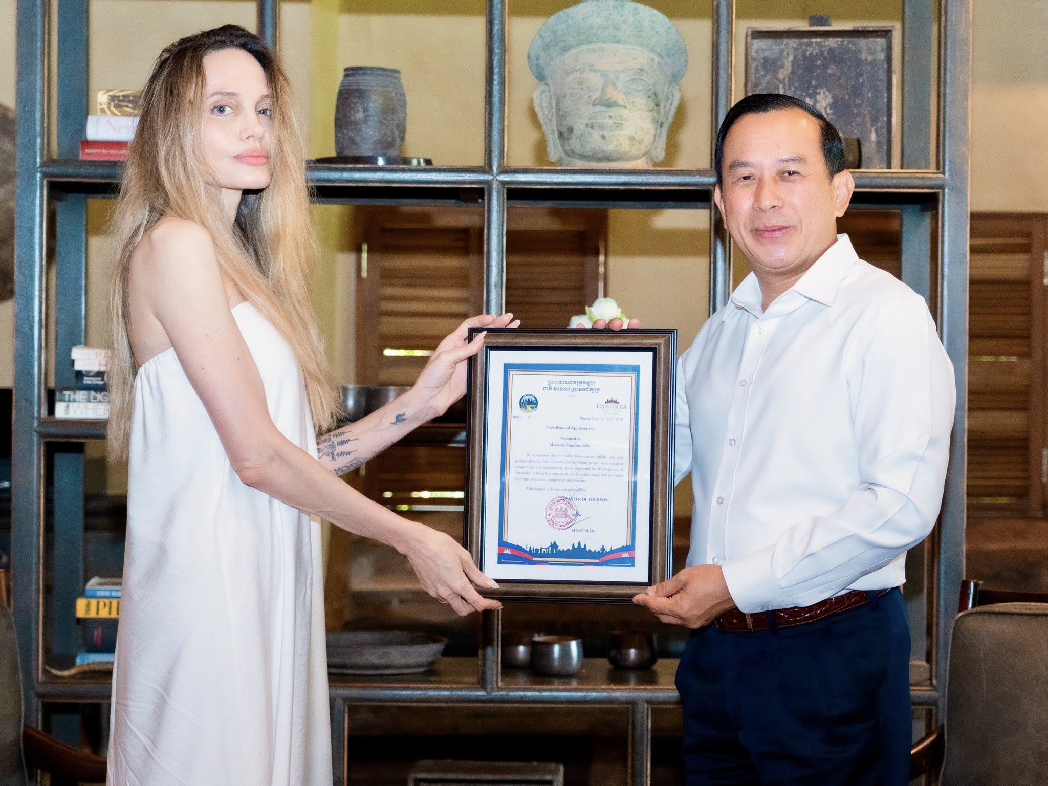 ក្នុងជំនួបនៅថ្ងៃទី៣ ខែមេសា ឆ្នាំ២០២៦ លោក ហួត ហាក់ និងលោកស្រីអេនជេលីណា ជូលី បានផ្លាស់ប្ដូរយោបល់អំពីការលើកកម្ពស់កិត្តិនាមកម្ពុជាលើឆាកអន្តរជាតិ តាមរយៈសកម្មភាពនានាដូចជា ការផ្សព្វផ្សាយគោលដៅទេសចរណ៍កម្ពុជា សកម្មភាពការងារគាំទ្រសហគមន៍ សកម្មភាពគាំទ្រវិស័យវប្បធម៌ សិល្បៈ និងសង្គម ក៏ដូចការងារអភិរក្សធនធានធម្មជាតិ។ «ព្រោះមានក្ដីស្រឡាញ់ ដ៏ជ្រាលជ្រៅចំពោះប្រទេសកម្ពុជា និងប្រជាជនកម្ពុជា លោកស្រី អេនជេលីណា ជូលី ប្តេជ្ញាចូលរួមផ្សព្វផ្សាយសក្តានុពលទេសចរណ៍ ដ៏អស្ចារ្យរបស់ព្រះរាជាណាចក្រកម្ពុជា ទៅកាន់ពិភពលោក ស្របតាមទិសស្លោកម្នាក់ៗជាផ្សព្វផ្សាយទេសចរណ៍កម្ពុជាម្នាក់» នេះជាទឹកចិត្តរបស់កំពូលតារាលំដាប់ពិភពលោករូបនេះ ដែលបង្ហាញក្នុងជំនួបជាមួយលោក ហួត ហាក់ ហើយត្រូវបានផ្សព្វផ្សាយលើទំព័រហ្វេសប៊ុកក្រសួងទេសចរណ៍។