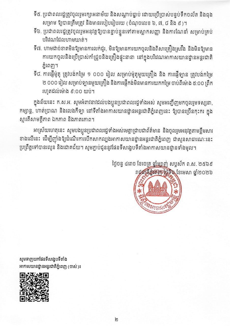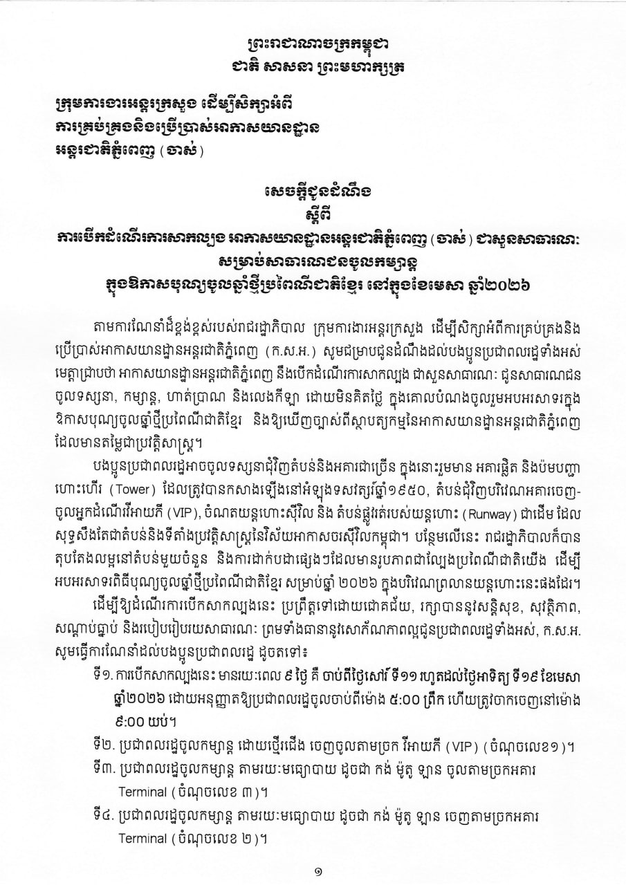 រាជធានីភ្នំពេញ៖ រាជរដ្ឋាភិបាលកម្ពុជា សម្រេចបើកអាកាសយានដ្ឋានអន្តរជាតិភ្នំពេញ ឬព្រលានយន្តហោះពោធិ៍ចិនតុង (ជាព្រលានចាស់) ឱ្យសាធារណជនចូលកម្សាន្ត និងហាត់ប្រាណដោយសេរី ចាប់ពីថ្ងៃទី១១ រហូតដល់ថ្ងៃទី១៩មេសា ចាប់ពីម៉ោង៥ព្រឹក រហូតដល់ម៉ោង៩យប់។ ក្រុមការងារអន្តរក្រសួង ដើម្បីសិក្សាអំពីការគ្រប់គ្រង និងការប្រើប្រាស់អាកាសយានដ្ឋានអន្តរជាតិភ្នំពេញ ហៅកាត់ថា ក.ស.អ. បានជូនដំណឹងនេះនៅថ្ងៃទី៦មេសា ឆ្នាំ២០២៦..។