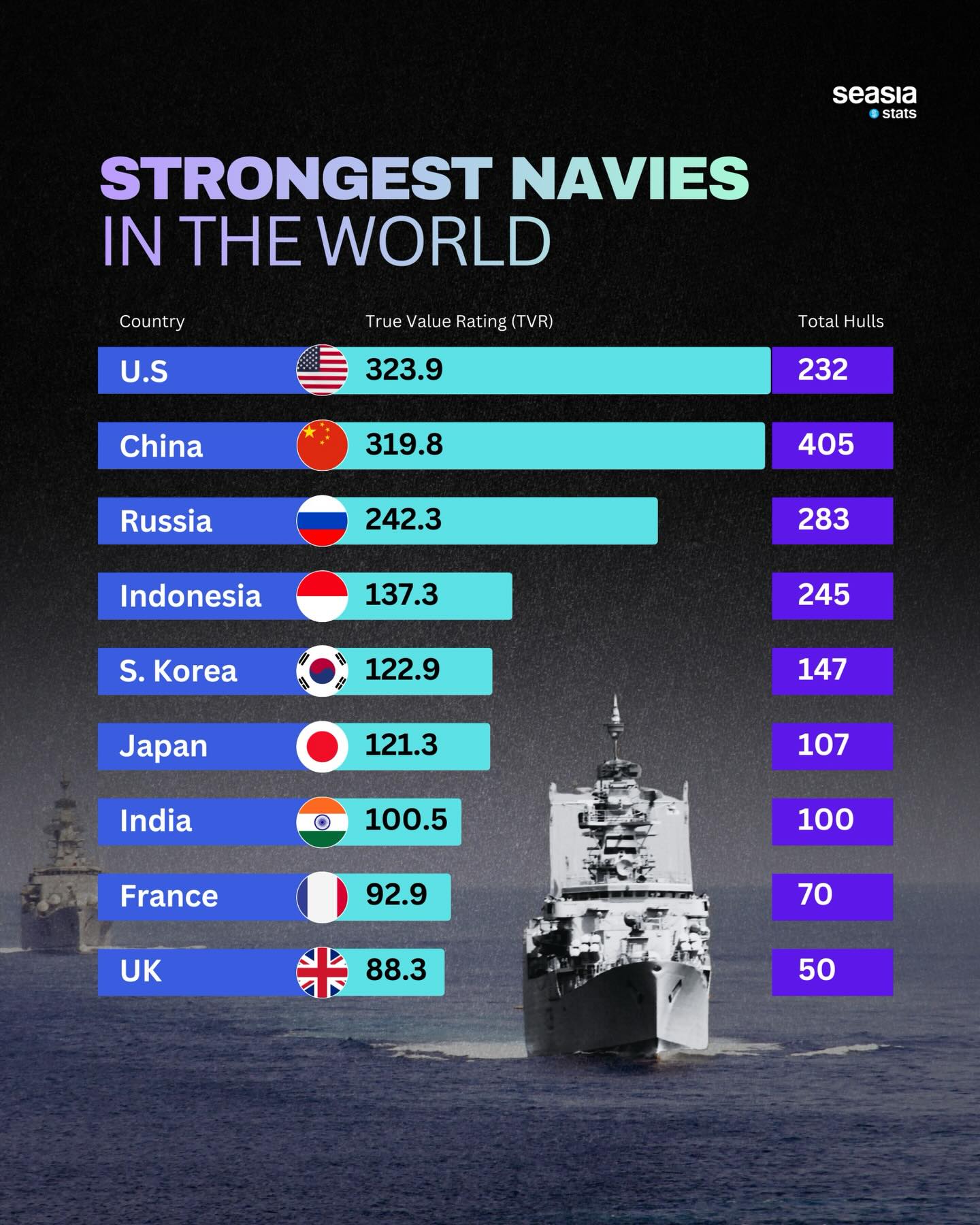 ការពិត..ប្រកែកមិនបាន សហរដ្ឋអាម៉េរិក បន្តក្តោបក្តាប់តំណែងលេខ១ ជាមួយកម្រិតពិន្ទុវាយតម្លៃ (TVR) ចំនួន៣២៣,៩ និងមាននាវាសរុបចំនួន២៣២គ្រឿង។ កងទ័ពជើងទឹកសហរដ្ឋអាម៉េរិក បានរួមបញ្ចូលគ្នានូវបច្ចេកវិទ្យាដ៏ទំនើបៗ វិសាលភាពគ្របដណ្ដប់ទូទាំងសកលលោក និងបទពិសោធប្រតិបត្តិការ ដែលគ្មាននរណាអាចប្រៀបផ្ទឹមបាន។ តាមពីក្រោយយ៉ាងប្រកៀកនោះគឺ ប្រទេសចិន ទទួលបានកម្រិតពិន្ទុវាយតម្លៃ៣១៩,៨។ ដ្បិតថាទទួលបានលេខ២ ប៉ុន្តែកងទ័ពជើងទឹកប្រជាជនចិន មានមោទកភាពចំពោះចំនួននាវាច្រើនជាងគេបំផុតលើលោក គឺមានរហូតដល់៤០៥គ្រឿង។ នេះឆ្លុះបញ្ចាំងពីការរីកចម្រើនផ្នែកកងទ័ពជើងទឹកយ៉ាងឆាប់រហ័សបំផុតរបស់ស្តេចនាគរាជចិន។ ចំណាត់ថ្នាក់លេខ៣ បានទៅលើប្រទេសរុស្ស៊ី។ រុស្ស៊ីនៅតែរក្សាវត្តមានយ៉ាងរឹងមាំជាមួយនឹងកម្រិតពិន្ទុវាយតម្លៃ២៤២,៣ ខណៈមហាអំណាចនុយក្លេអ៊ែរមួយនេះ មាននាវាចំនួន២៨៣គ្រឿង។