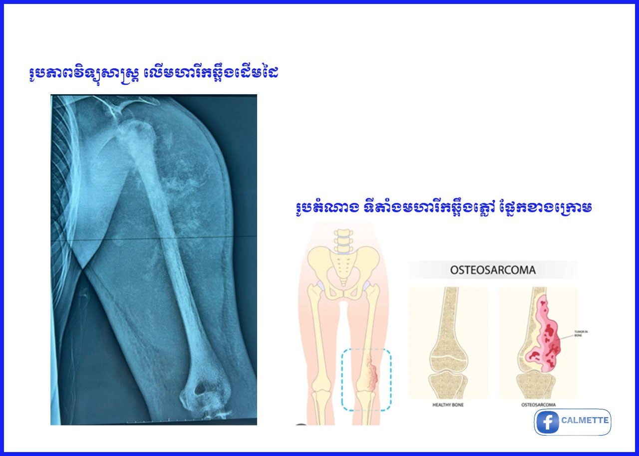 សុខភាព៖ មហារីកឆ្អឹង ជាជំងឺសាច់កាចដែលកើតនៅលើឆ្អឹង ភាគច្រើនកើតលើក្មេងជំទង់អាយុចន្លោះពី១៣ ទៅ១៦ឆ្នាំ តែករណីខ្លះ ក៏អាចកើតមានលើមនុស្សពេញវ័យដែរ។ មហារីកឆ្អឹង ច្រើនកើតនៅលើឆ្អឹងវែង ដូចជា ឆ្អឹងដើមដៃ ឆ្អឹងភ្លៅ និងឆ្អឹងស្មងជើង។ នេះបើតាមការឱ្យដឹងពីគ្រូពេទ្យនៃមន្ទីរពេទ្យកាល់ម៉ែត…។