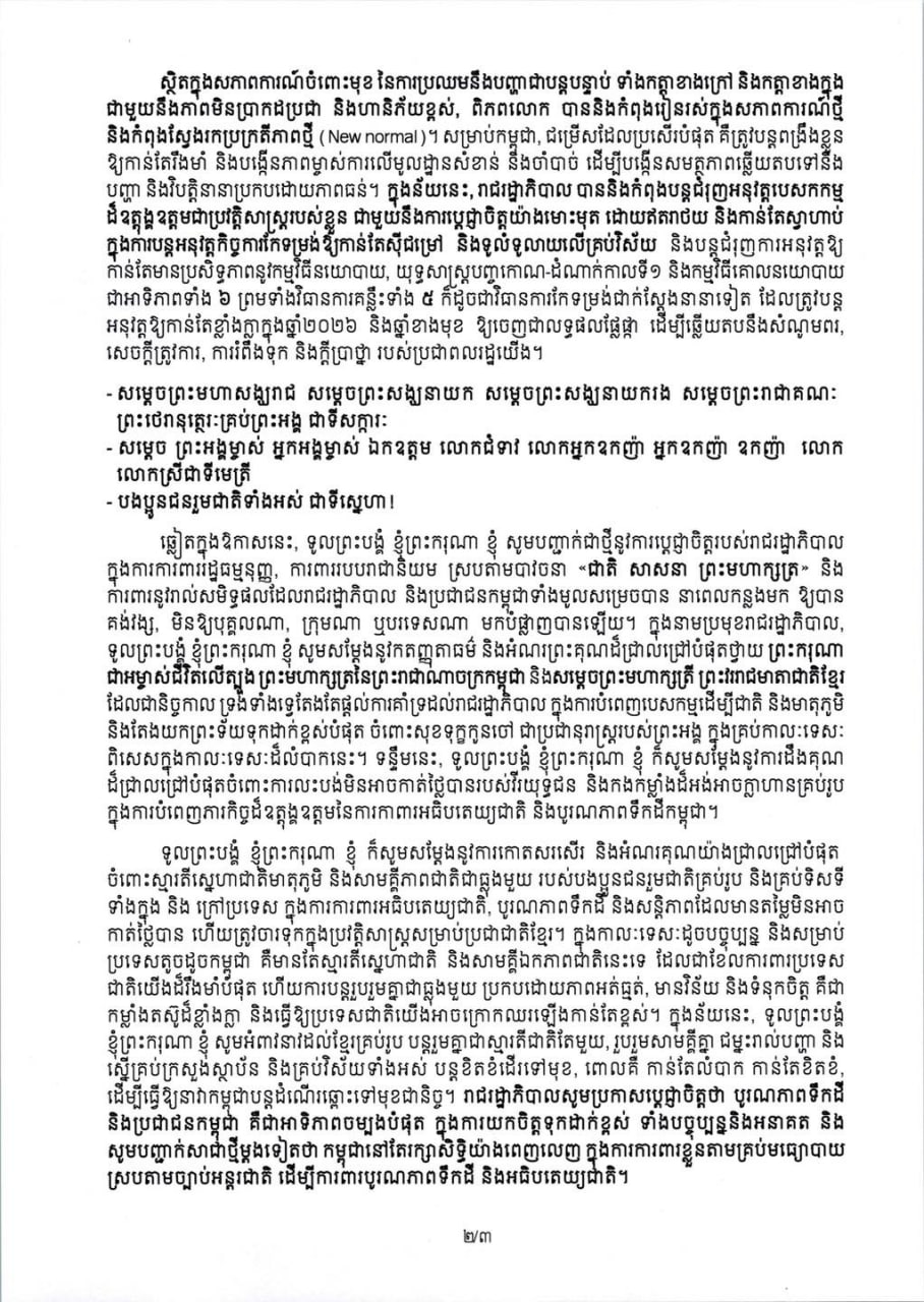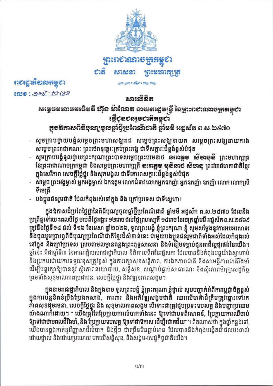 ផ្ញើសារជូនជនរួមជាតិ ក្នុងឱកាសពិធីបុណ្យចូលឆ្នាំថ្មី ប្រពៃណីជាតិខ្មែរ ដែលនឹងចូលមកដល់នៅថ្ងៃទី១៤មេសា ឆ្នាំ២០២៦ សម្ដេចធិបតី ហ៊ុន ម៉ាណែត មានប្រសាសន៍ថា ក្នុងឆ្នាំកន្លងទៅ យើងបានឆ្លងកាត់នូវវិញ្ញាសាដ៏លំបាក និងថ្មីៗជាច្រើនមិនធ្លាប់មានដែលបាននិងកំពុងបង្កើតជាផលប៉ះពាល់ដោយផ្ទាល់ និងដោយប្រយោលមកលើសន្តិសុខ និងសង្គម-សេដ្ឋកិច្ចជាតិកម្ពុជា។ ដូច្នេះ យើងត្រូវតែប្រែក្លាយការលំបាកទាំងនេះឱ្យទៅជាបទពិសោធ, ប្រែក្លាយការឈឺចាប់ឱ្យទៅជាថាមពលដ៏រឹងមាំ និងប្រែក្លាយឧបសគ្គឱ្យទៅជាឱកាសដើម្បីជោគជ័យ។ «ក្នុងនាមរាជរដ្ឋាភិបាល ខ្ញុំសូមបញ្ជាក់អំពីការប្តេជ្ញាចិត្តខ្ពស់ក្នុងការបន្តខិតខំប្រឹងប្រែងកសាង ការពារ និងអភិវឌ្ឍសង្គមជាតិ ឈរលើមាគ៌ាដ៏ត្រឹមត្រូវ ឆ្ពោះទៅរកភាពសុខដុមរមនា សេចក្តីថ្លៃថ្នូរ និងសុខុមាលភាពសង្គម បើទោះជាត្រូវជួបប្រទះឧបសគ្គ និងបញ្ហាប្រឈមយ៉ាងណាក៏ដោយ»។