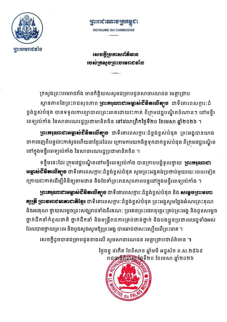 រាជធានីភ្នំពេញ៖ ព្រះករុណាជាអម្ចាស់ជីវិតតម្កល់លើត្បូង ជាទីគោរពសក្ការដ៏ខ្ពង់ខ្ពស់បំផុត ព្រះអង្គទទួលបានការវះកាត់ដោយជោគជ័យហើយ បន្ទាប់ពីទទួលការព្យាបាលព្រះរោគដោយក្រុមវេជ្ជបណ្ឌិតចំណានៗនៅមន្ទីរពេទ្យរដ្ឋធានីប៉េកាំងនៃសាធារណរដ្ឋប្រជាមានិតចិន នាវេលាព្រឹកថ្ងៃទី២០ ខែមេសា ឆ្នាំ២០២៦នេះ…។