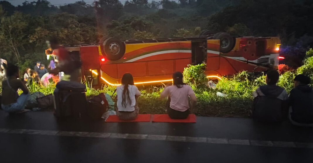 រដ្ឋធានីវៀងចន្ទន៍៖ រថយន្តក្រុងដឹកអ្នកដំណើរពេលយប់មួយគ្រឿង បានក្រឡាប់ផ្ងារជើងទ្រមេឃនៅថ្ងៃពុធទី២២ ខែមេសានេះ នៅក្នុងស្រុកប៉ាកកាឌីង (ປາກກະດິງ) ខេត្តបលិខាំសៃ(ບໍລິຄໍາໄຊ) ប្រទេសឡាវ បណ្ដាលឱ្យមនុស្ស៨នាក់បាត់បង់ជីវិត និង ៣៥នាក់ផ្សេងទៀតរងរបួស។ នេះបើយោងតាមការបញ្ជាក់ពីមន្ត្រីអាជ្ញាធរខេត្ត...។