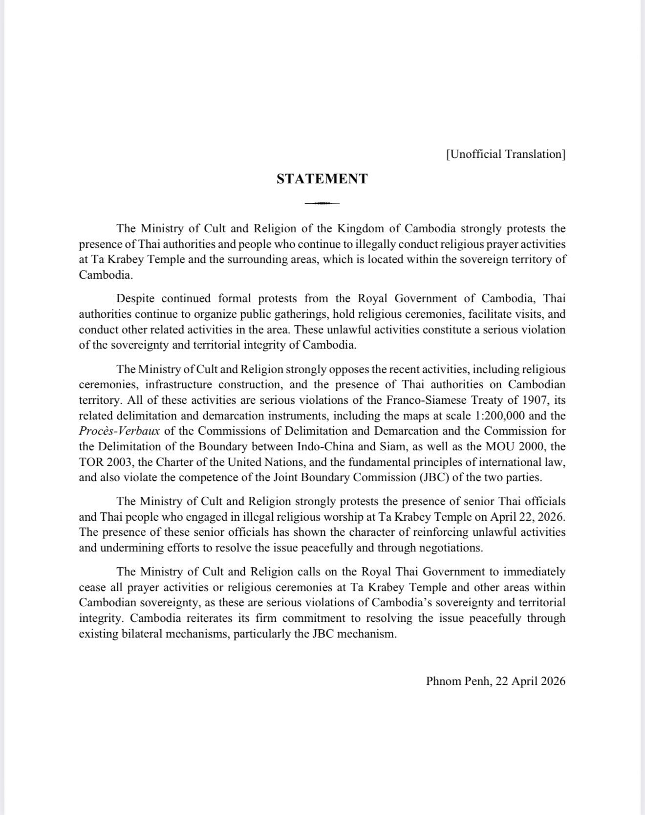 រាជធានីភ្នំពេញ៖ ក្រសួងធម្មការ និងសាសនា បន្តតវ៉ាយ៉ាងខ្លាំងក្លាបំផុត ចំពោះវត្តមានរបស់អាជ្ញាធរ និងប្រជាជនថៃ ដែលបានធ្វើសកម្មភាពខុសច្បាប់ រៀបចំពិធីបួងសួងបែបជំនឿសាសនានៅ«ប្រាសាទតាក្របី និងតំបន់ជុំវិញ» ដែលជាទីតាំងស្ថិតនៅក្នុងដែនអធិបតេយ្យភាពរបស់កម្ពុជា កាលពីថ្ងៃទី២២ ខែមេសា ឆ្នាំ២០២៦...។