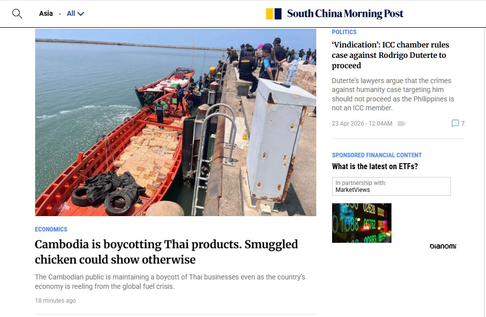 រាជធានីភ្នំពេញ៖ ស្រមោលនៃទំនាក់ទំនងព្រំដែនរវាងកម្ពុជា-ថៃ ដ៏តានតឹង កាសែតអន្តរជាតិរបស់ប្រទេសចិនដ៏ល្បីមួយ មានឈ្មោះថា South China Morning Post បានចុះផ្សាយអត្ថបទមួយនៅថ្ងៃទី២៣ ខែមេសា ឆ្នាំ២០២៦ អំពីរូបភាពដ៏គួរឱ្យភ្ញាក់ផ្អើល ដែលបង្ហាញពីស្មារតីជាតិនិយមដ៏ខ្លាំងក្លារបស់អ្នកស្នេហាជាតិកម្ពុជា ចំពោះការពហិការទំនិញរបស់ថៃ...។