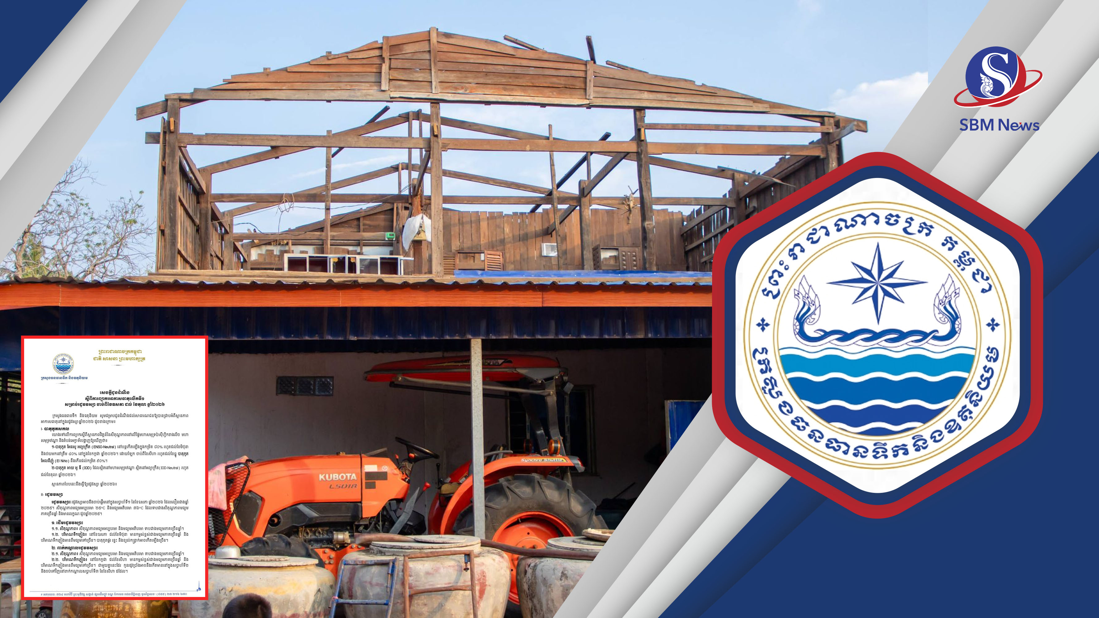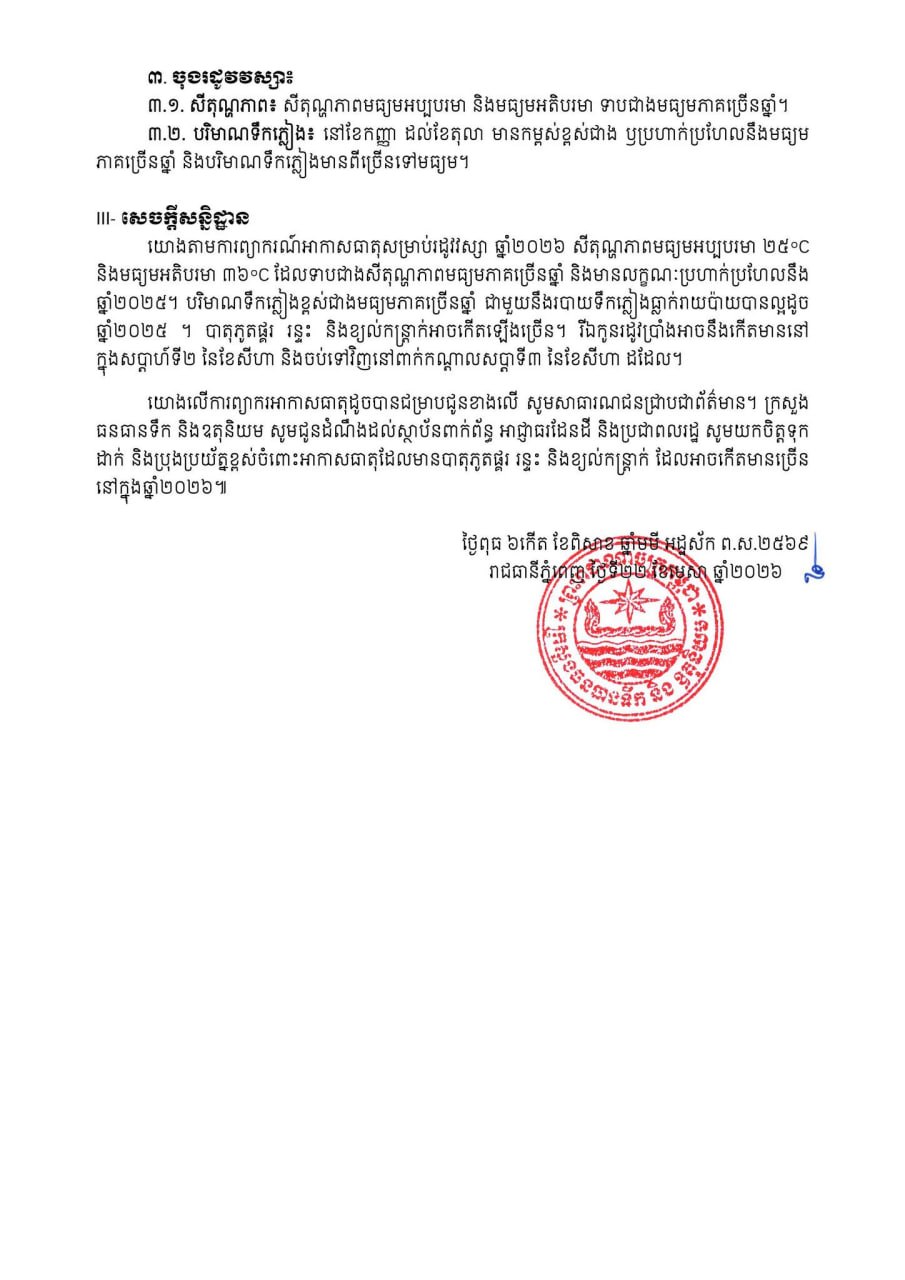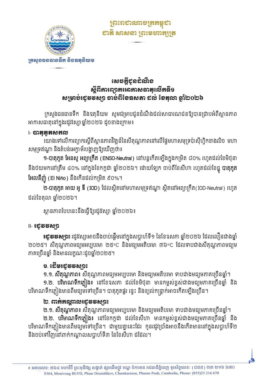 ផ្អែកតាមការព្យាករអាកាសធាតុលើកទី១ សម្រាប់រដូវវស្សា ចាប់ពីខែឧសភា ដល់ខែតុលា ឆ្នាំ២០២៦ ក្រសួងធនធានទឹក អះអាថា រដូវវស្សាអាចនឹងចាប់ផ្តើមនៅក្នុងសប្តាហ៍ទី១នៃខែឧសភា ពោលគឺលឿនជាងឆ្នាំ២០២៥។ ចំពោះសីតុណ្ហភាពវិញ មានលក្ខណៈដូចឆ្នាំមុន គឺចន្លោះពី២៥ទៅ៣៦អង្សាសេ។ ក្នុងនោះ ដើមរដូវវស្សាចាប់ពីខែឧសភា ដល់ខែមិថុនា បរិមាណទឹកភ្លៀងមានពីមធ្យមទៅច្រើន ហើយអាចសម្បូរបាតុភូត ផ្គរ រន្ទះ និងខ្យល់កន្ត្រាក់កើតឡើង។