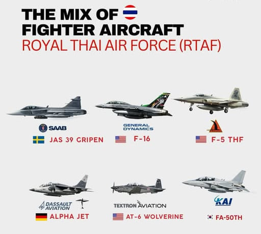 រាជធានីបាងកក៖ ក្នុងចំណោមបណ្តាប្រទេសនៅអាស៊ីអាគ្នេយ៍ កងទ័ពអាកាសភូមិន្ទថៃ (ឬ RTAF) ត្រូវបានគេចាត់ទុកថា ជាកម្លាំងទ័ពអាកាសដ៏ខ្លាំងក្លាបំផុតមួយ។ ទន្ទឹមនឹងរបាយការណ៍ថ្មីមួយ បានបង្ហាញពីយន្តហោះចម្បាំងថៃជាច្រើនប្រភេទ និងមានប្រភពចម្រុះ ដោយថៃមិនពឹងផ្អែកលើមហាអំណាចយោធាតែមួយនោះទេ ប៉ុន្តែបានប្រមូលផ្ដុំនូវបច្ចេកវិទ្យាកំពូលៗពីជុំវិញពិភពលោក។ គួរស្ដាយ..ថៃបានប្រើប្រាស់យន្តហោះចម្បាំងទាំងនោះមកឈ្លានពានកម្ពុជាយ៉ាងសាហាវឃោរឃៅ ដោយការទម្លាក់គ្រាប់បែកកម្ទេចសំណង់ប្រាសាទបុរាណខ្មែរ ហេដ្ឋារចនាសម្ព័ន្ធស៊ីវិល ភូមិឋាន និងផ្ទះសម្បែងប្រជាពលរដ្ឋស្លូតត្រង់កម្ពុជា យ៉ាងយង់ឃ្នងបំផុត...។