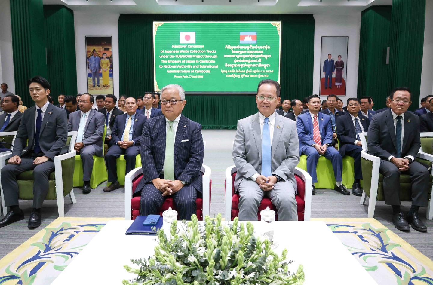 ពិធីប្រគល់ និងទទួលរថយន្តដឹកសំរាមនេះ ធ្វើឡើងក្រោមវត្តមានលោក អ៊ូអិណុ អាត់ស៊ូស៊ី(UENO Atsushi) ឯកអគ្គរាជទូតជប៉ុនប្រចាំកម្ពុជា និងលោក អ៊ាង សុផល្លែត រដ្ឋមន្ត្រីក្រសួងបរិស្ថាន។ រដ្ឋមន្រ្តីក្រសួងបរិស្ថាន បានថ្លែងអំណរគុណចំពោះលោកឯកអគ្គរាជទូត និងប្រជាពលរដ្ឋជប៉ុនទាំងអស់ ដែលបានរួមចំណែកជាមួយយុទ្ធសាស្ត្រចក្រាវិស័យបរិស្ថាន២០២៣-២០២៨ ដោយផ្តោតជាអាទិភាព លើភាពស្អាត ភាពបៃតង និងចីរភាព ឆ្ពោះទៅសម្រេចឱ្យបាននូវចក្ខុវិស័យកម្ពុជាស្អាត តាមរយៈវិធានការគន្លឹះជាជំហានៗ ដែលក្រសួងបរិស្ថានកម្ពុជា កំពុងបន្តយ៉ាងសកម្ម គឺការអប់រំ ផ្សព្វផ្សាយ ដើម្បីផ្លាស់ប្ដូរឥរិយាបថ និងកៀរគរការចូលរួមពីសាធារណជន។