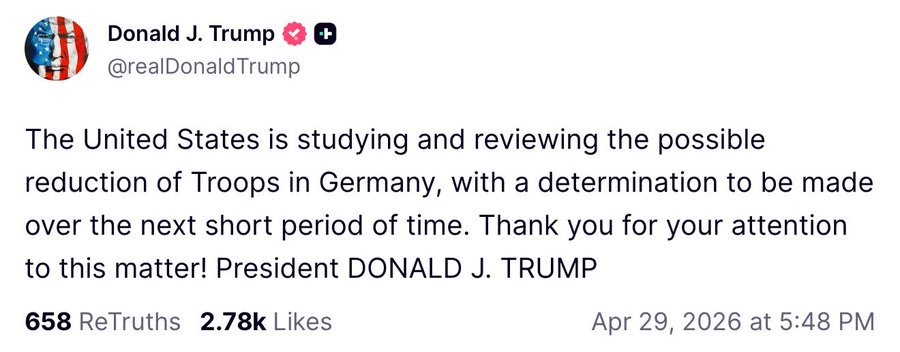 ការគំរាមកំហែងនេះ កើតឡើងបន្ទាប់ពីលោក ត្រាំ បានរិះគន់រដ្ឋធានីប៊ែរឡាំង និងសម្ព័ន្ធមិត្តណាតូផ្សេងទៀតយ៉ាងចាស់ដៃថា មិនបានបញ្ជូនកម្លាំងជើងទឹកទៅជួយបើកច្រកសមុទ្ទហ័រមូស្ស ក្នុងអំឡុងអាម៉េរិកកំពុងធ្វើសង្រ្គាមប្រឆាំងអ៊ីរ៉ង់។ លោក ត្រាំ បានសរសេរនៅលើបណ្តាញសង្គម Truth Social ថា៖«សហរដ្ឋអាម៉េរិកកំពុងសិក្សា និងពិនិត្យមើលលទ្ធភាពនៃការកាត់បន្ថយកងទ័ពនៅក្នុងប្រទេសអាល្លឺម៉ង់ ហើយការសម្រេចចិត្តនឹងត្រូវធ្វើឡើងក្នុងរយៈពេលដ៏ខ្លីខាងមុខនេះ»។ គម្រោងដកទ័ពនេះមិនមែនជារឿងថ្មីសន្លាងនោះទេ ដ្បិតមន្ត្រីជាន់ខ្ពស់សេតវិមានម្នាក់ធ្លាប់បានបង្ហើបកាលពីដើមខែមេសានេះថា លោក ត្រាំ ពិតជាបានពិភាក្សាអំពីលទ្ធភាពនៃការដកកងទ័ពអាម៉េរិកមួយចំនួនចេញពីតំបន់អឺរ៉ុបពិតប្រាកដមែន។