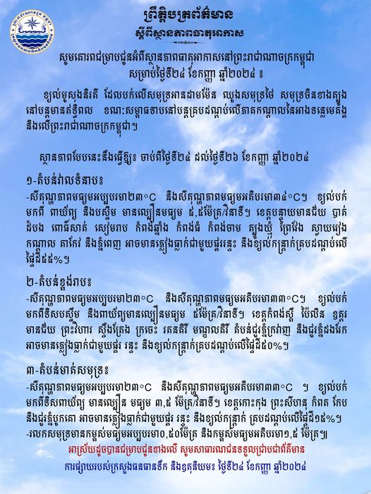 ពាក់ព័ន្ធជាមួយស្ថានភាពទឹកកើនឡើងនេះ ក្រសួងជំនាញអះអាងថា ខ្យល់មូសុងនិរតី ដែលបក់លើសមុទ្ទអាន់ដាម៉ាន់ ឈូងសមុទ្ទថៃ សមុទ្ទចិនខាងត្បូង នៅបន្តមានឥទ្ធិពល ខណៈសម្ពាធទាបនៅបន្តគ្របដណ្ដប់លើភាគកណ្តាលនៃអាងទន្លេមេគង្គ និងលើកម្ពុជា។ ស្ថានភាពបែបនេះនឹងធ្វើឱ្យ៖ ចាប់ពីថ្ងៃទី២៤ ដល់ថ្ងៃទី២៦កញ្ញា តំបន់វាលទំនាប តំបន់ខ្ពង់រាបតំបន់មាត់សមុទ្ទ អាចមានភ្លៀងធ្លាក់ជាមួយផ្គរ រន្ទះ និងខ្យល់កន្ត្រាក់ គ្របដណ្ដប់លើផ្ទៃដី១៥ទៅ៥៥ភាគរយផងដែរ៕